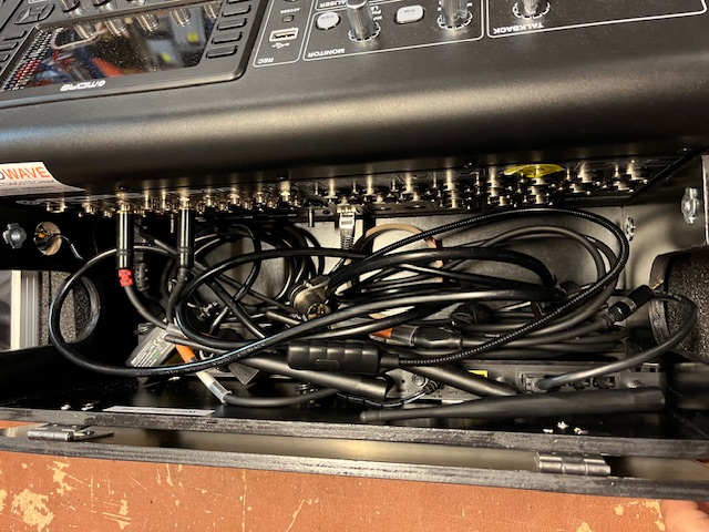 Stabiles Case mit 6 Griffen, Rollen, sodass die Haube hinter dem Pult stehen kann, ordentlich gepolstert, mit Dog-House für Steckdosenleiste und Router etc.