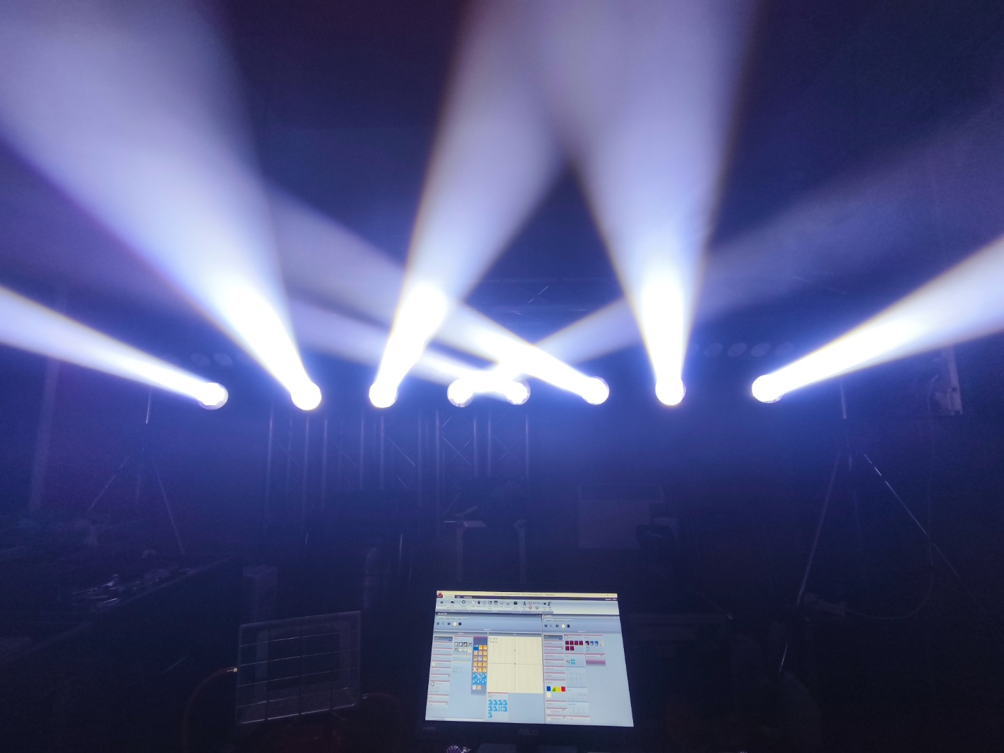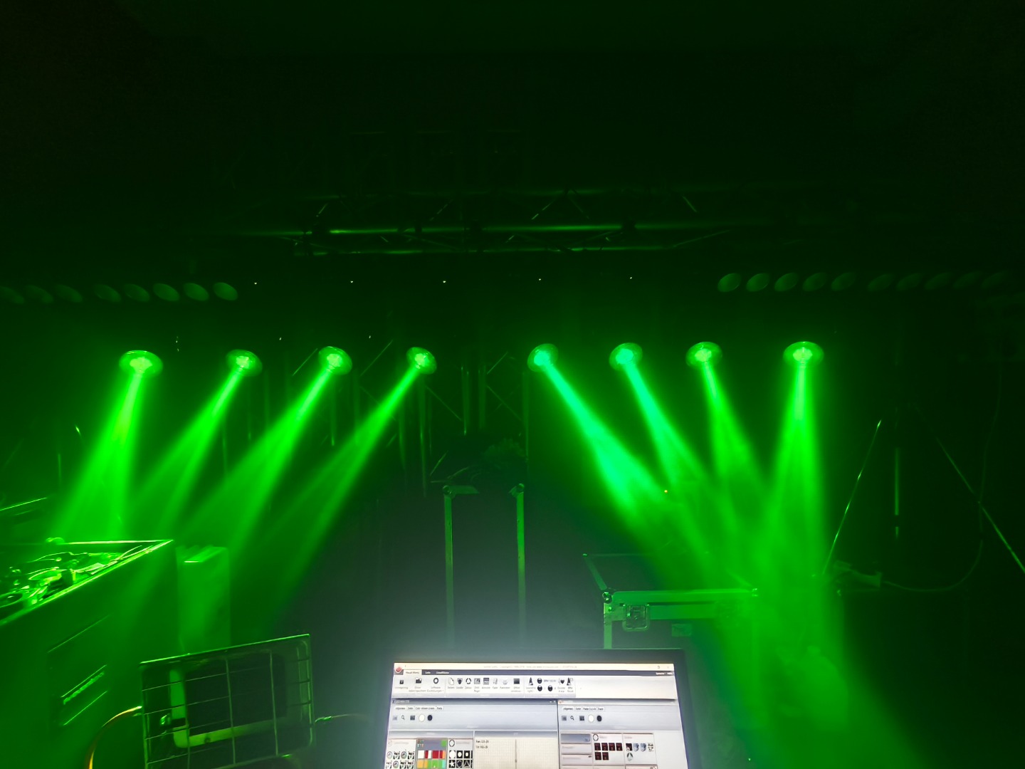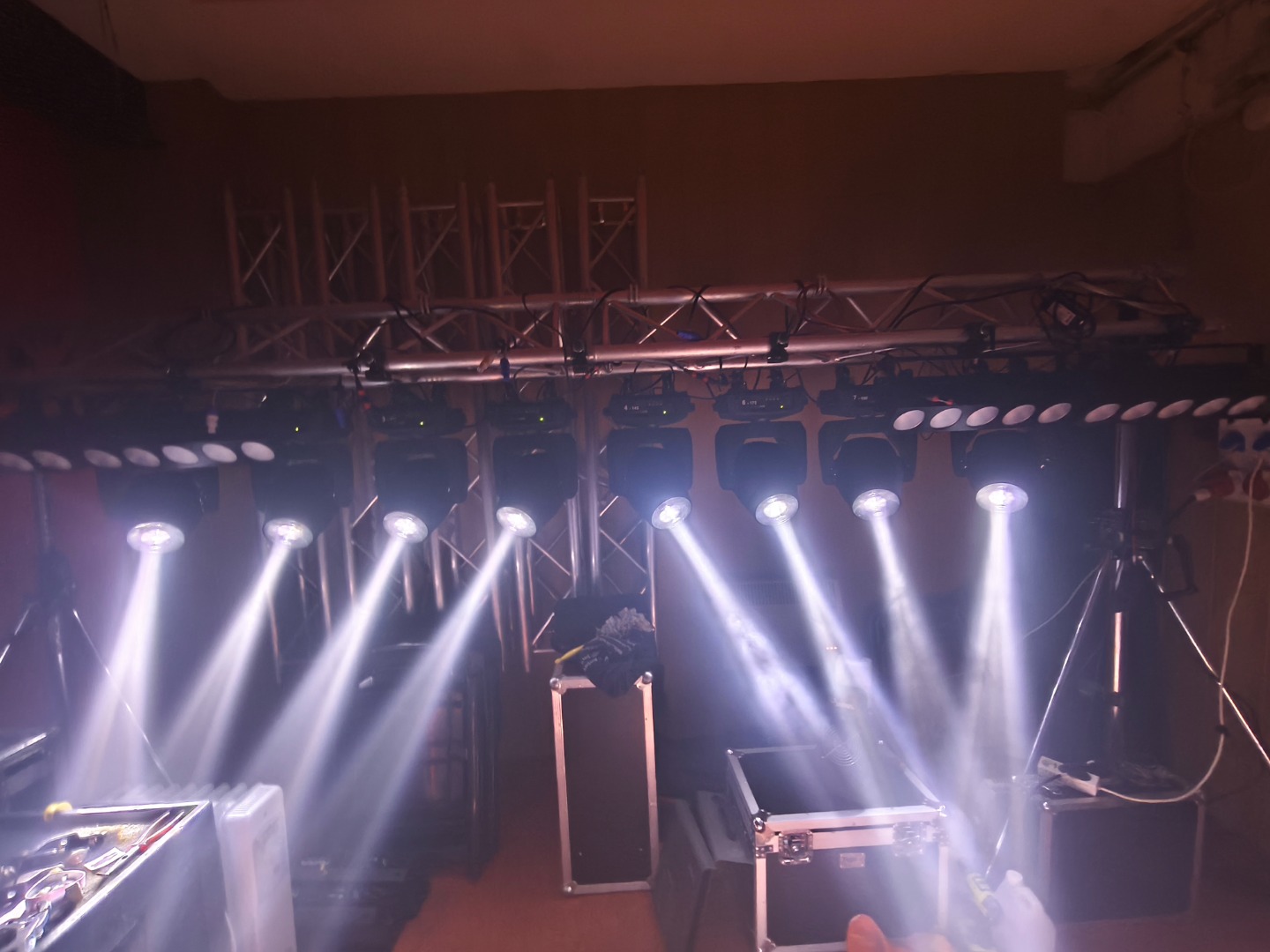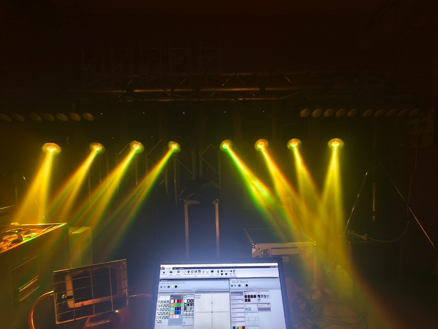 Gesamtbetriebsstunden nur ca. 800-1200 je Gerät. Ein Movinghead hat einen kleinen Riss in der PVC-Linse (siehe Foto). Keine Funktionseinschränkung dadurch.