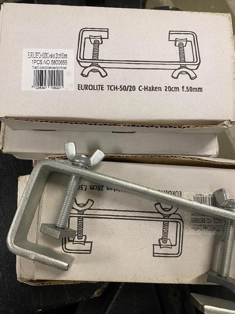 wir verkaufen hier 6 × EUROLITE TCH-50/20 C-Haken, silber – robuste Montagehaken für Traversen, Aluminium-Rohre und Bars.