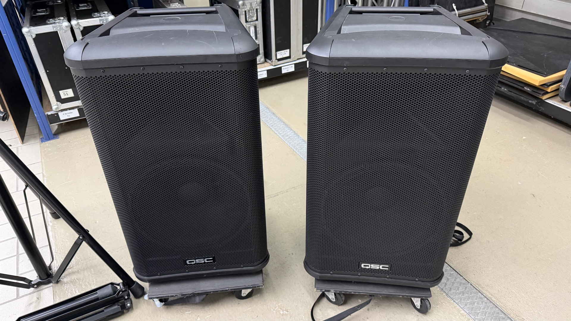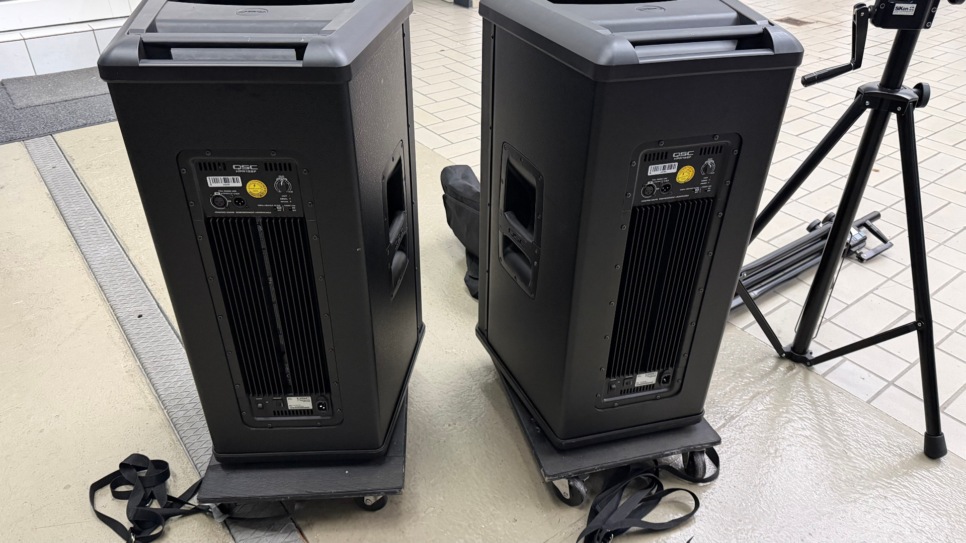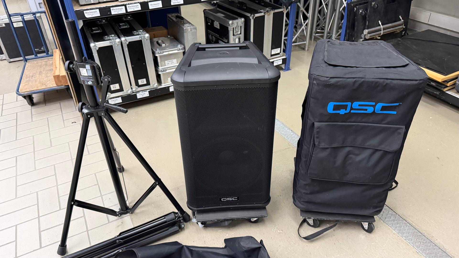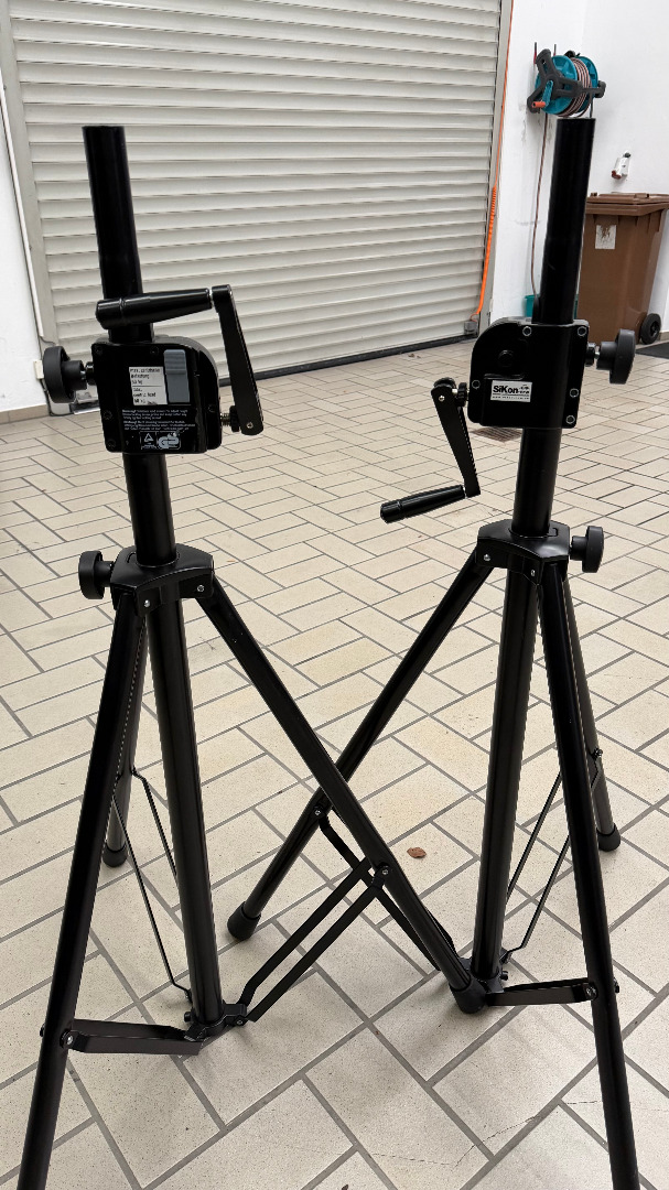 Verkaufe hier 2 sehr gut erhaltene aktiv Lautsprecher incl. Stoffcover, Kurbel Stativ und Rollbrett.