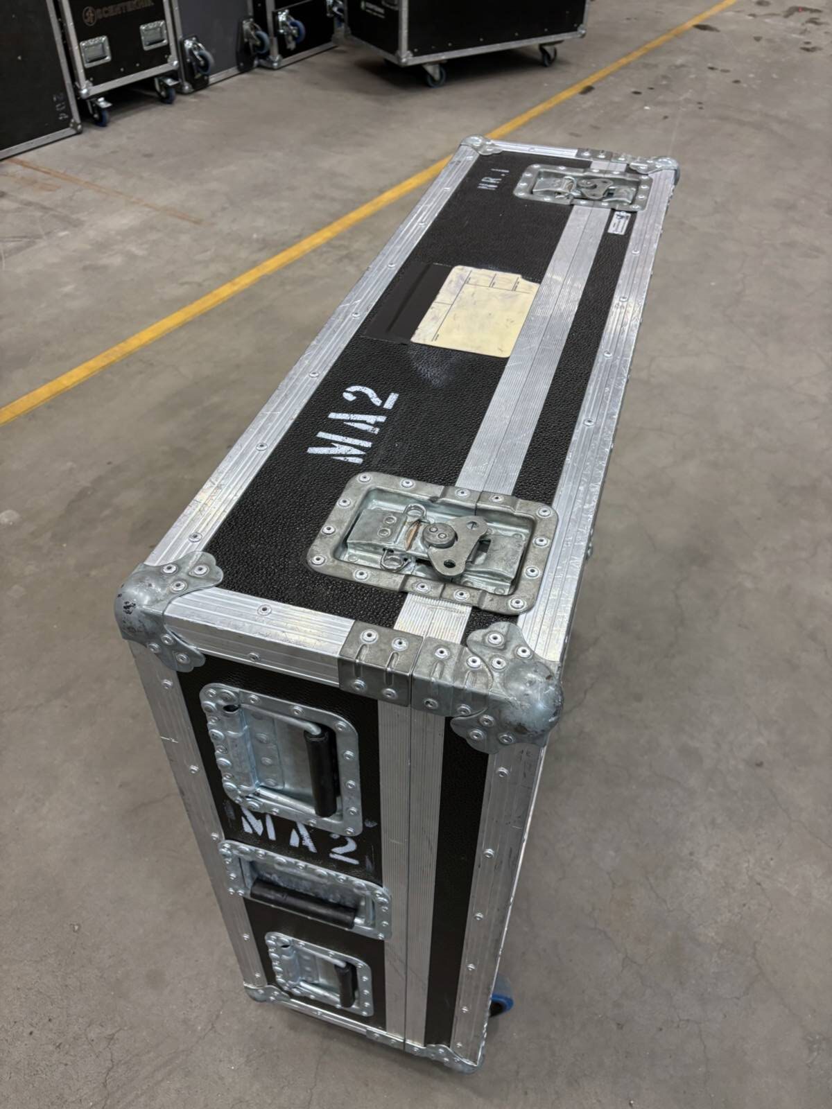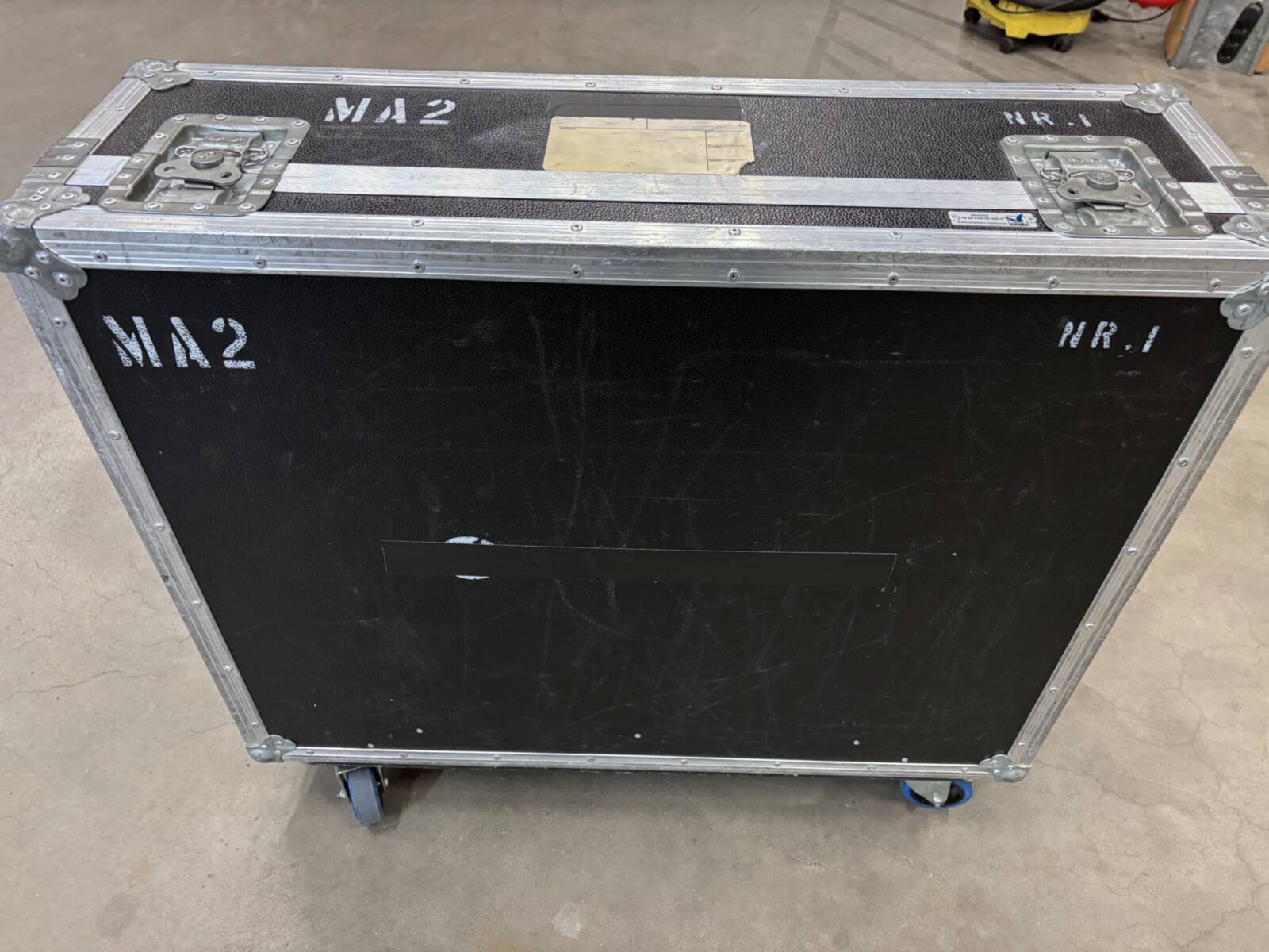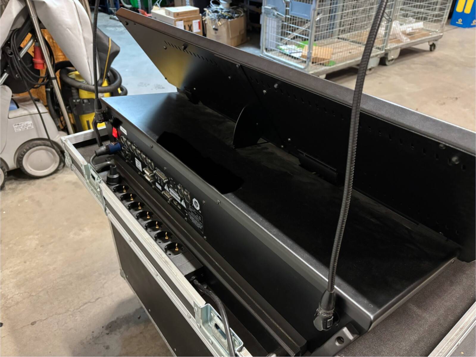 Compact control desk previously used only for corporate events, showing surface scratches on the paint from handling, but functionally reliable. Includes a flight case, dust cover, two LED gooseneck desk lamps, and a power cable.