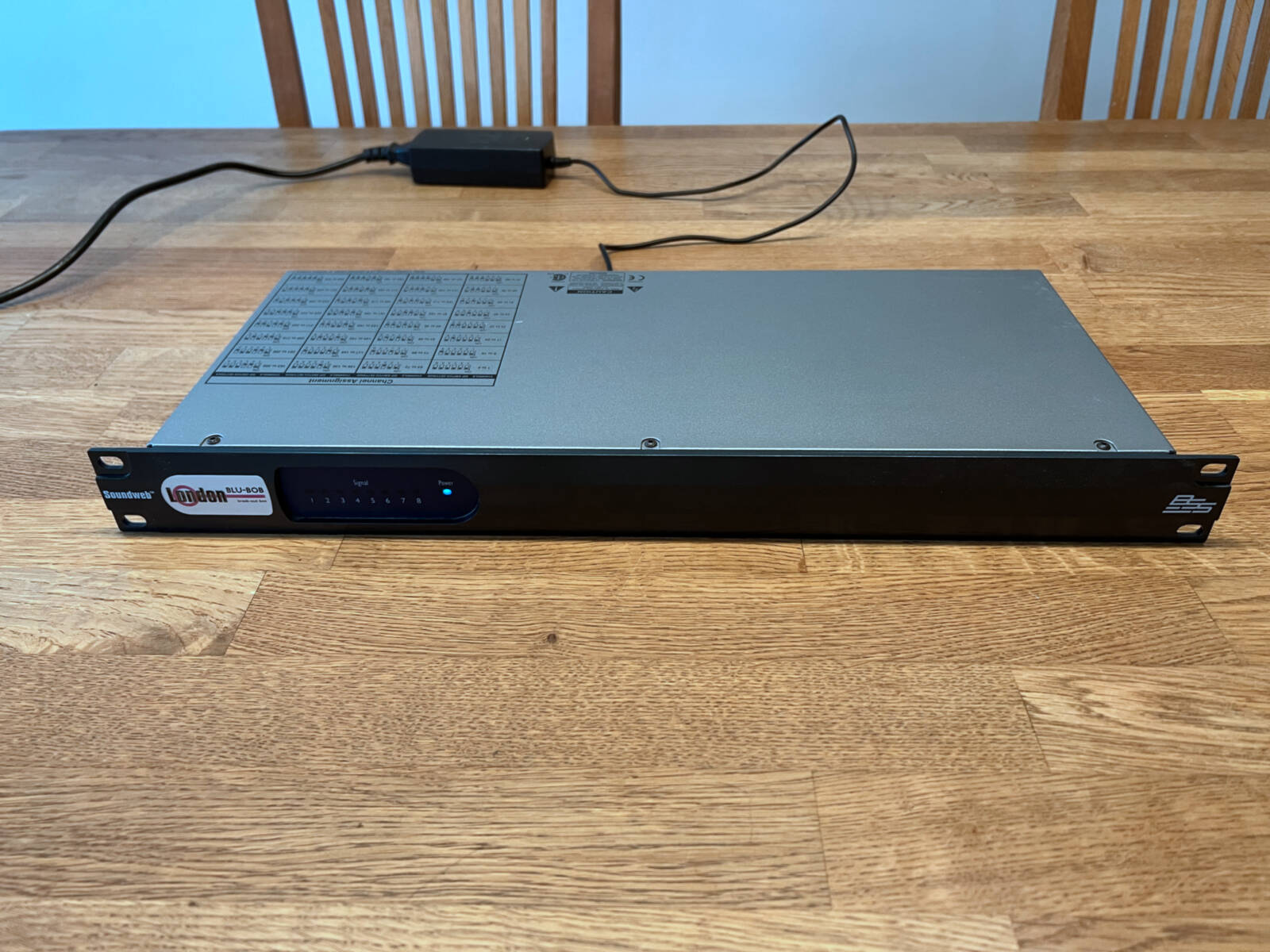 Offers 8 channels of analog audio output expansion via a digital audio bus with low latency and fault tolerance. Supports 256-channel audio over standard Cat 5e cabling up to 100m, or over 10km with an optional fiber optic media converter. Includes a 12V DC power adapter. Ideal for expanding output in installation setups.
