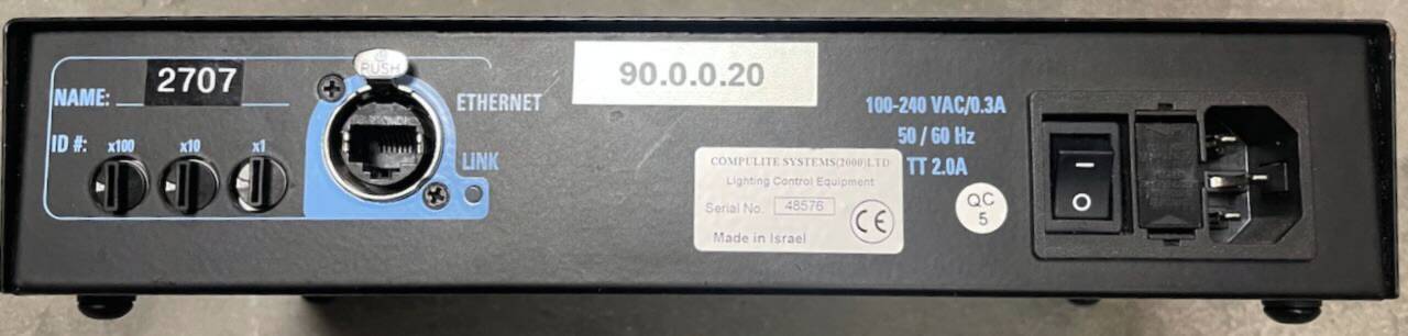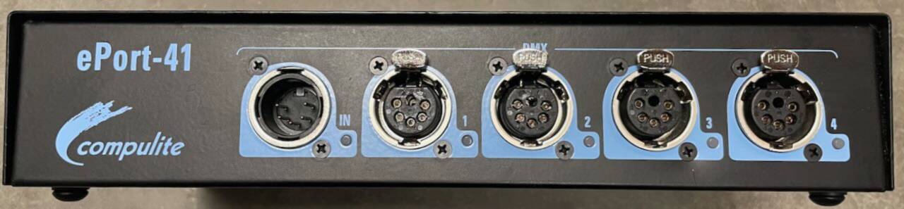 Features a 4-universe output and 1-universe input, compatible with Compulite C-net and Art Net protocols, and includes free C-Net Manager software for configuration.
