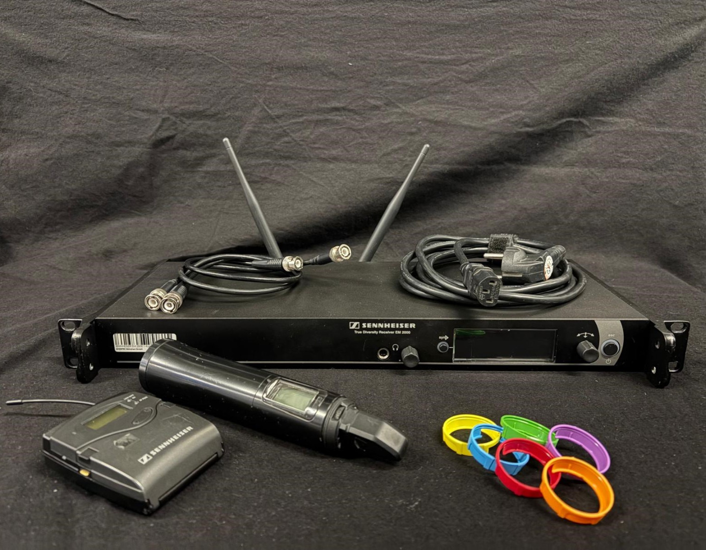 Das Funkmikrofon Set besteht aus einem Empfänger, der Sennheiser EM 2000 im CW-Frequenzband (718 – 790 MHz), einem SKM 2000 Handsender ohne Kapsel und dem SK 2000 Taschensender. Die Geräte sind vollkommen funktionsfähig und waren auch bis vor kurzem noch im Einsatz.