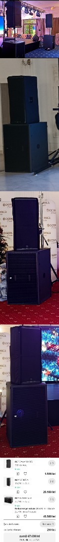Vând Sistem Audio Profesional RCF - Stare Impecabilă (Ca Nou) format din 2 boxe active și 2 subwoofere RCF, ideal pentru trupe, DJ sau evenimente private. Echipamentul a fost întreținut obsesiv, arată și funcționează ca în prima zi.