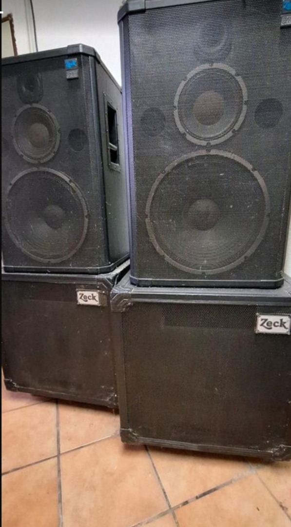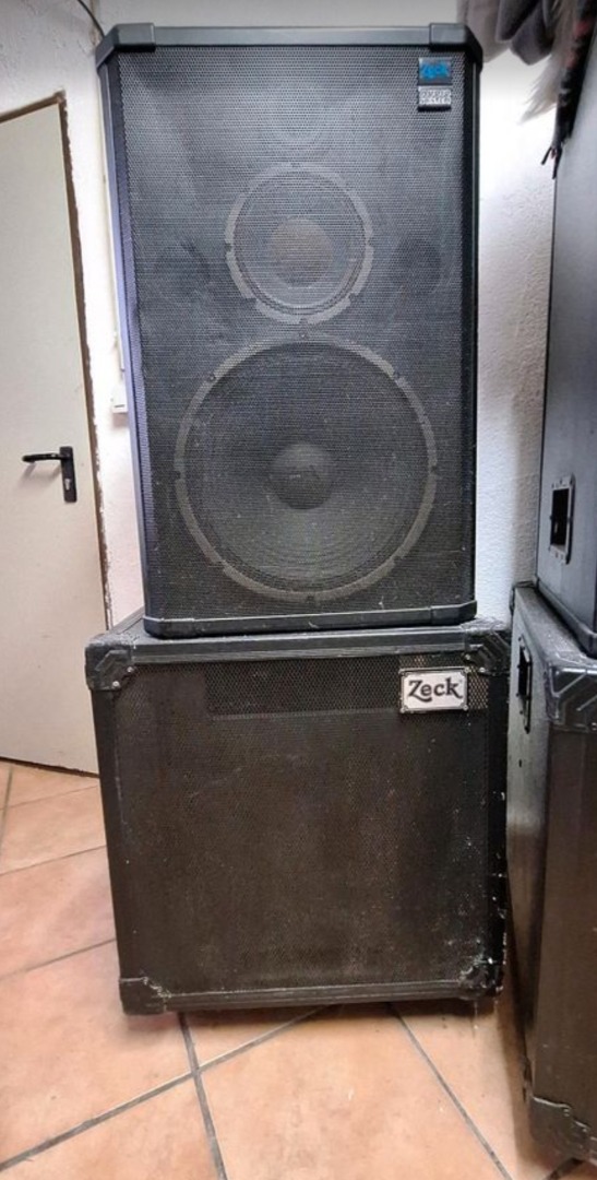 Zum Verkauf stehen 2 mal 15 Zoll Bässe und 2 mal 15 Zoll Hochtöner.
