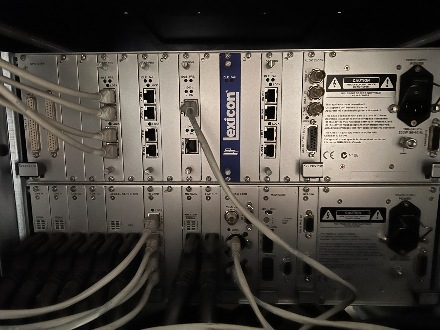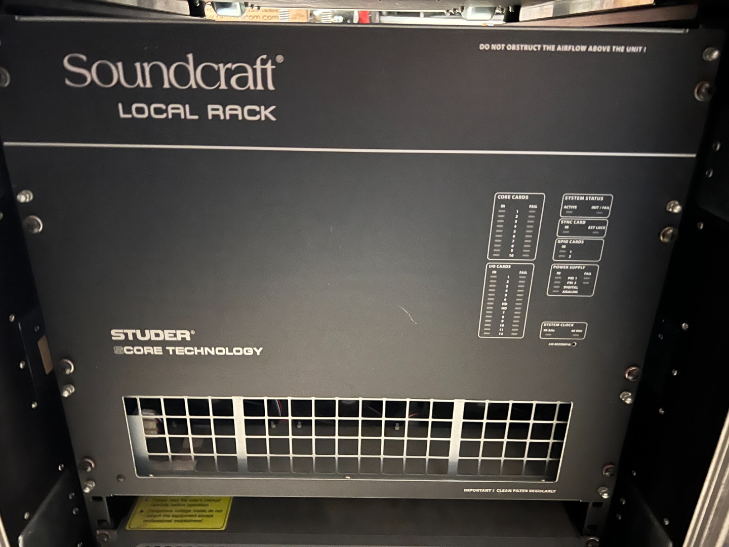 1 x Local Rack with 3 x DSP card, 1 x Lexicon FX, 16 x Line I/O, 16 x AES/EBU I/O, Talkcack, 3 x MIC IN, 2 x Madi card for redundancy Cat5 or fiber with rack