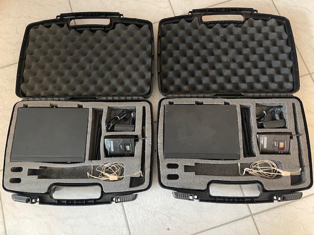 2 x LD Systems WS1G8 mit Bodypacks und Headset in je einem Koffer mit 19" Rackwinkel für zwei Empfänger.
