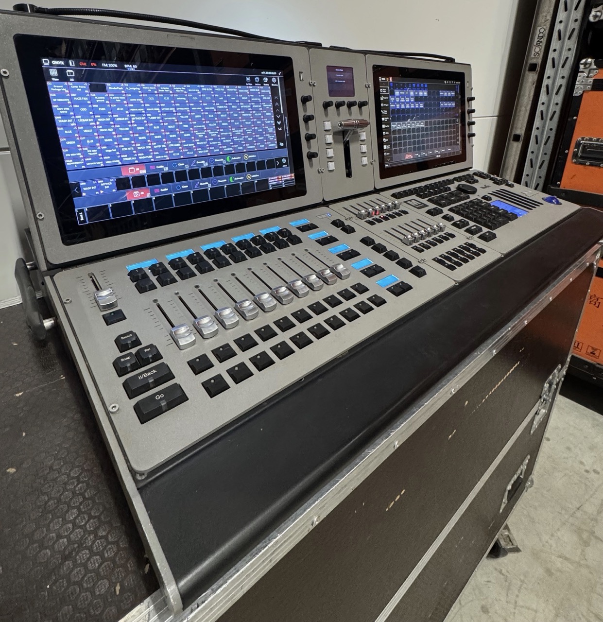 Lighting control console with some cosmetic scratches and minor top surface damage that does not impact functionality. Comes with a flight case for transport and protection.