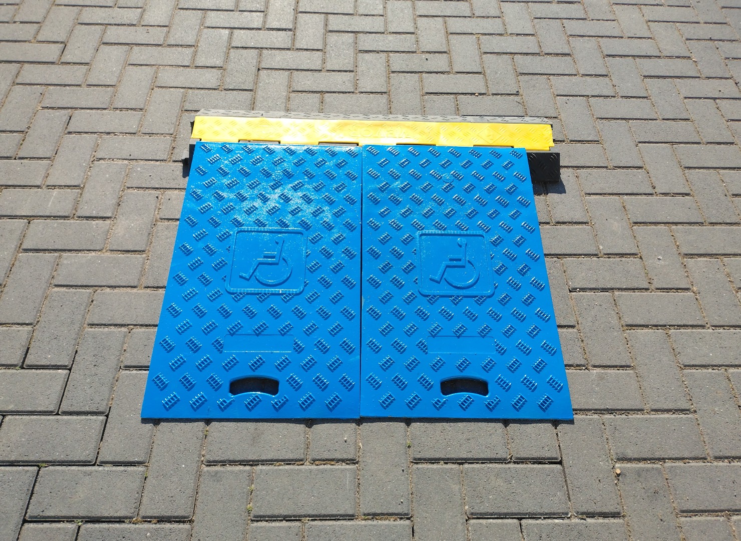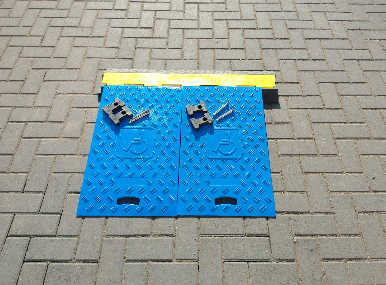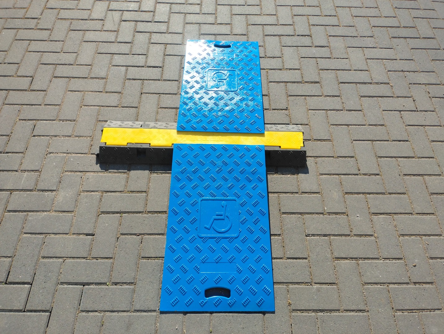 Zum Verkauf steht ein Set-Rollstuhlrampen für Kabelbrücken in Blau.