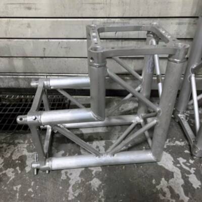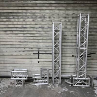 Comprehensive truss package including multiple square truss sections of various lengths, T-crosses, 90-degree corners, hinges, and baseplates—suitable for flexible rigging configurations. Offer consideration possible.