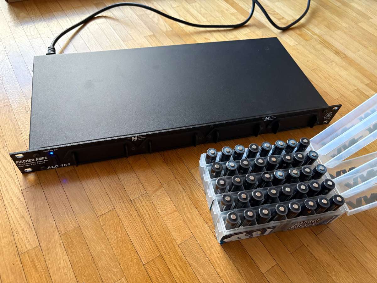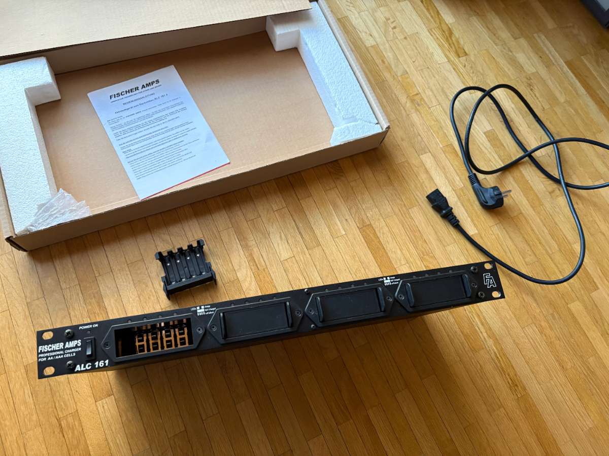 Zum Verkauf steht das gebrauchte und top gepflegte 16fach Rack-Aufladegerät Fischer Amps ALC 161 MKII und 40 Stück Panasonic BK-3HCDE Ni-MH „eneloop pro“ AA-Batterien.
