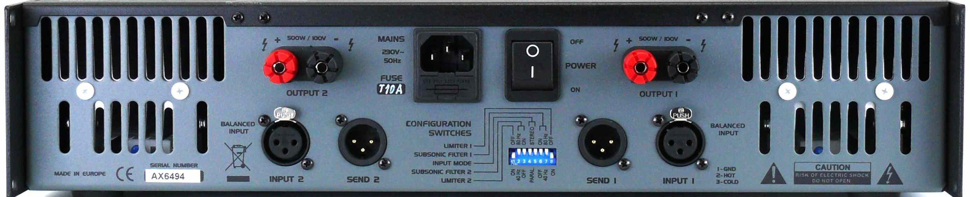 Installationsverstärker 2 HE, 2x500 W an 100 V mit Übertragerausgang (erdfreier Betrieb).