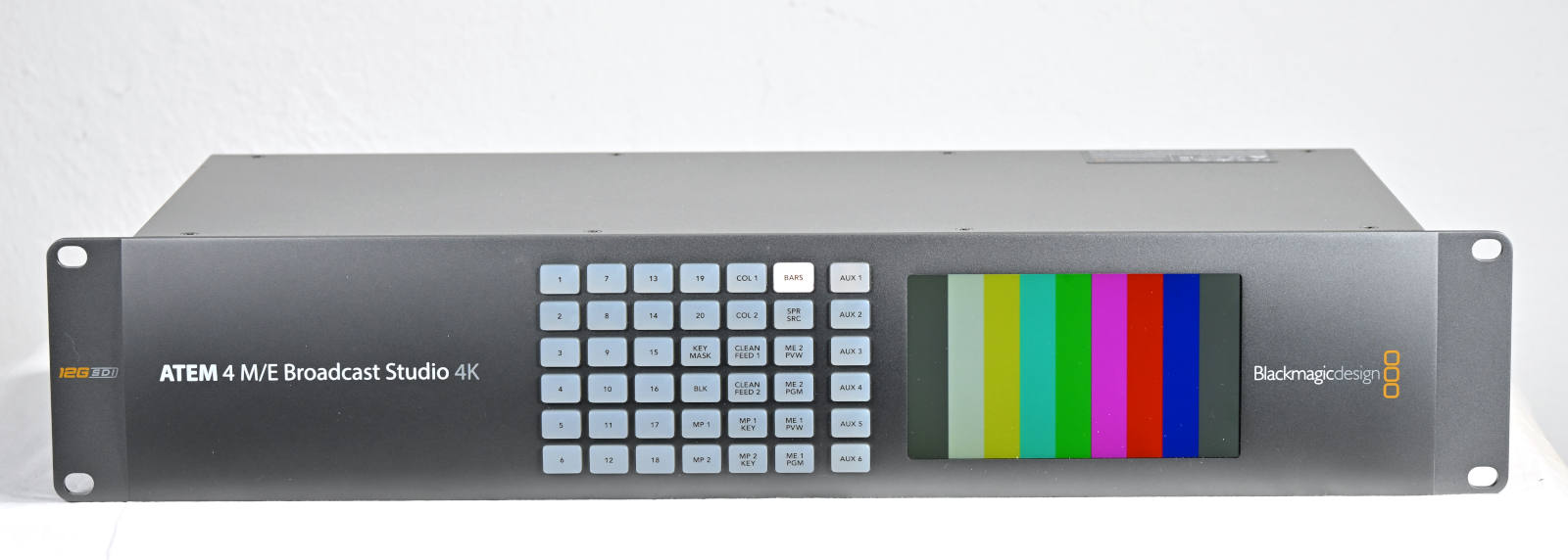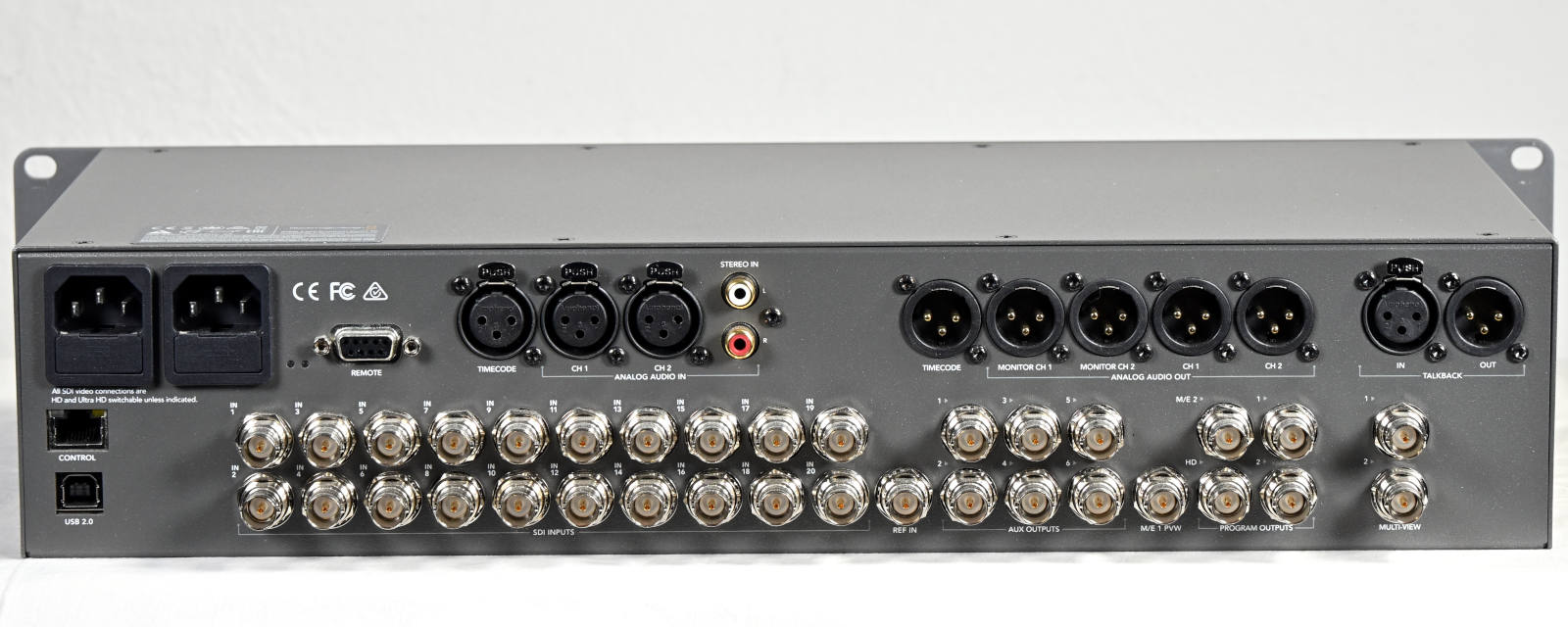 Advanced Ultra HD switcher enables live broadcasting in SD, HD, and Ultra HD formats and features 20 6G-SDI inputs, SuperSource™, digital video effects, and motion graphics capabilities. The unit is from a production studio and shows minimal signs of use.
