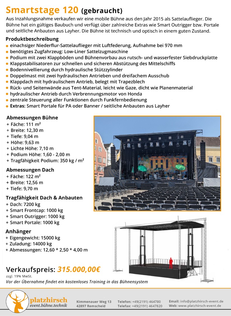 Die Bühne hat ein gültiges Baubuch und verfügt über zahlreiche Extras wie Smart Outrigger bzw. Portale und seitliche Anbauten aus Layher. Die Bühne ist technisch und optisch in einem guten Zustand.