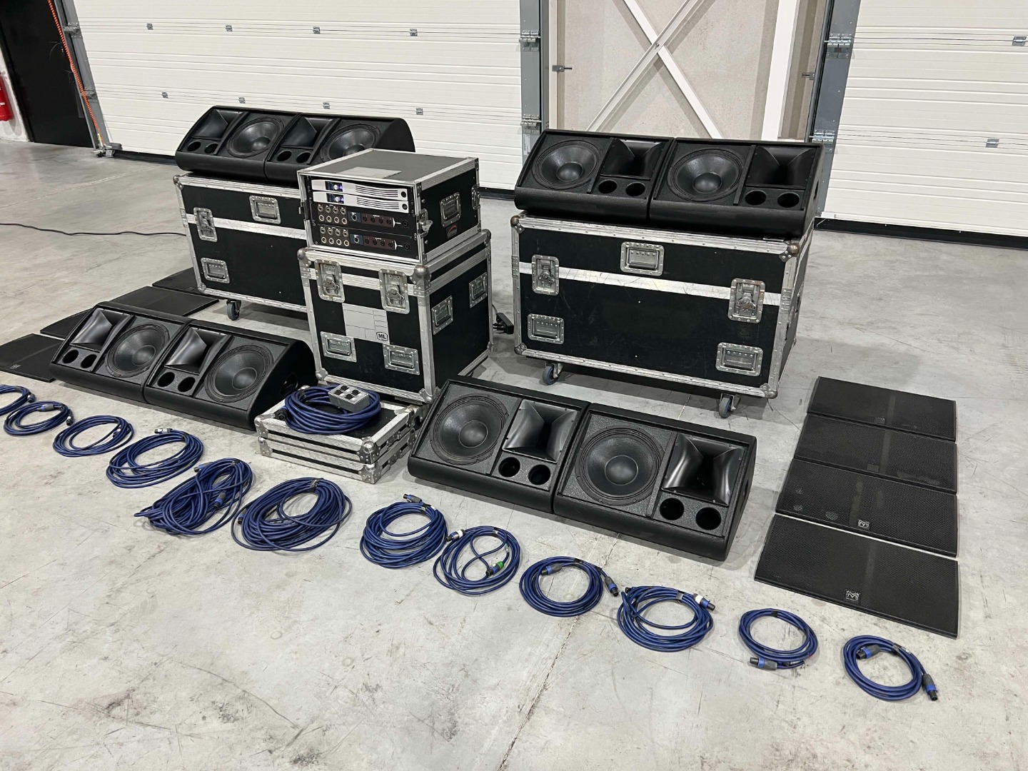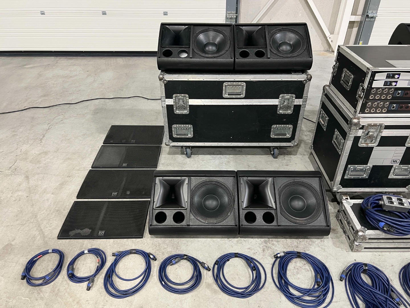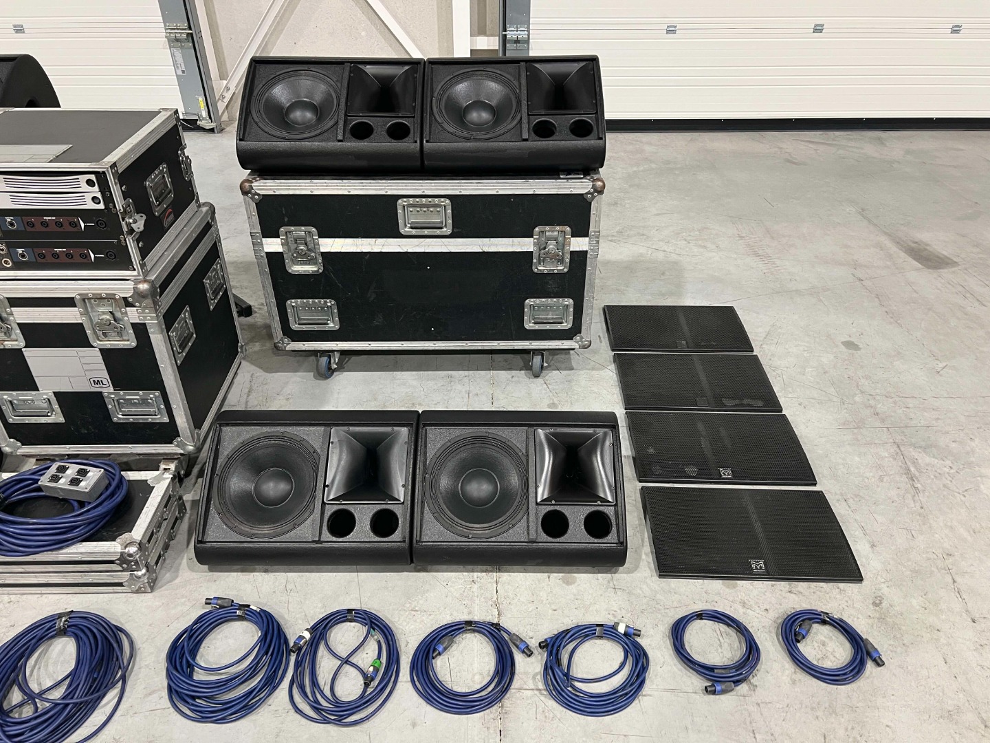- The middle wheeled flight case, on which the amplifier rack is placed, is not included.