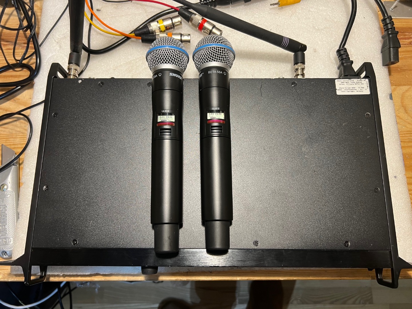 hier bieten wir zwei Shure ULXD4D Dual-Empfänger mit Dante-Anschluss sowie zwei Mikrofone mit SM58 an.