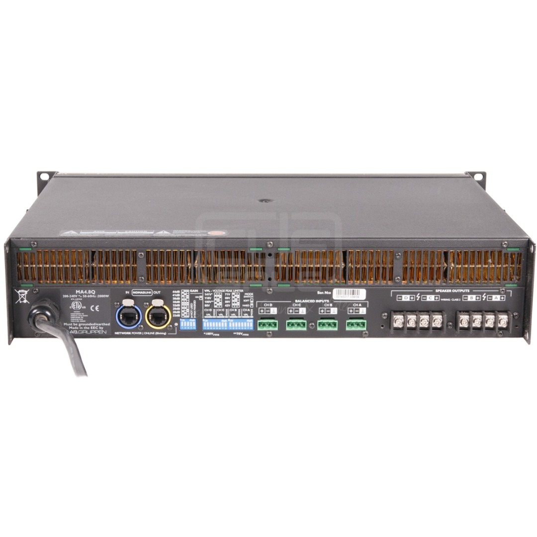 Housed in a convenient 2U package, the MA4.8Q 4-channel amplifier allows for the adjustment of maximum voltage peak, gain adjustment and has on-board network capability for monitoring and control. With these features it is now possible to specify identical amplifiers in an installation and then adjust each output to the very specific requirements of the speaker system. A typical large-scale system is a combination of high-powered speakers, full range in-fill speakers, 70/100V ceiling speakers, with an active speaker management system. With switchable outputs and on-board network capabilities, the MA4.8Q can be designed into a complete value engineered system handling all amplification tasks.