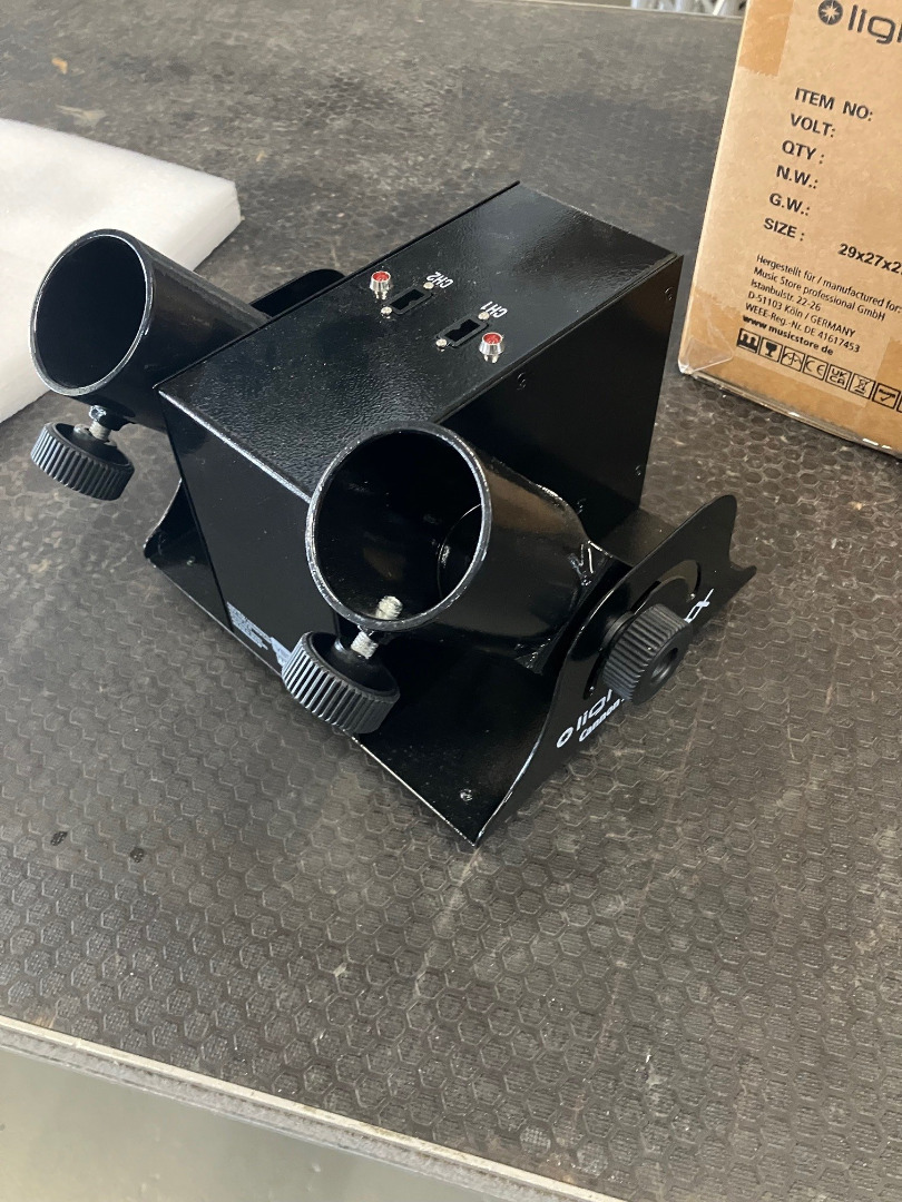 Auch an die Montage an einer Traverse wurde gedacht, auf der Unterseite befindet sich ein M10 Gewinde, so können ganz einfach herkömmliche Coupler zur Montage befestigt werden. Natürlich kann der lightmaXX Cannon Shot FX TWO auch auf eine ebene Fläche ohne zusätzliche Bodenplatte gestellt werden. Somit kann man ihn nahezu überall verwenden.