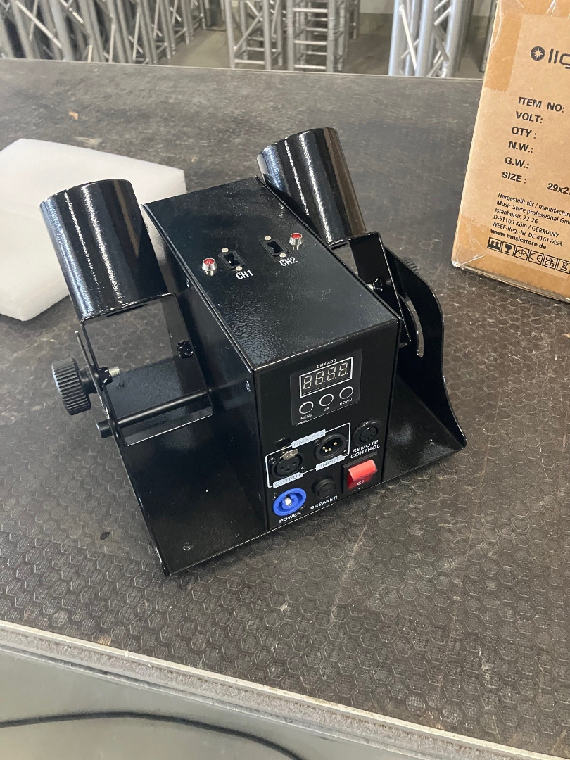 Der lightmaXX Cannon Shot FX TWO ist eine kompakte Schusseinheit zum Abfeuern von elektrischen Konfetti- und Streamer-Kanonen. Hier können zwei Konfetti- und Streamer-Kanonen gleichzeig oder einzeln abgefeuert werden. Dies ist möglich per mitgelieferten Funk Steuerung oder über DMX. Da hierbei auf Sicherheit sehr geachtet wird, daher verfügt der Shooter über einen DMX Sicherheits-Kanal, so kann der Shooter nicht versehentlich via DMX ausgelöst werden. Auf der Oberseite des Cannon Shot FX TWOs ist eine Safety LED verbaut, so sieht man ob noch Spannung auf dem Schuss Kanal ist.