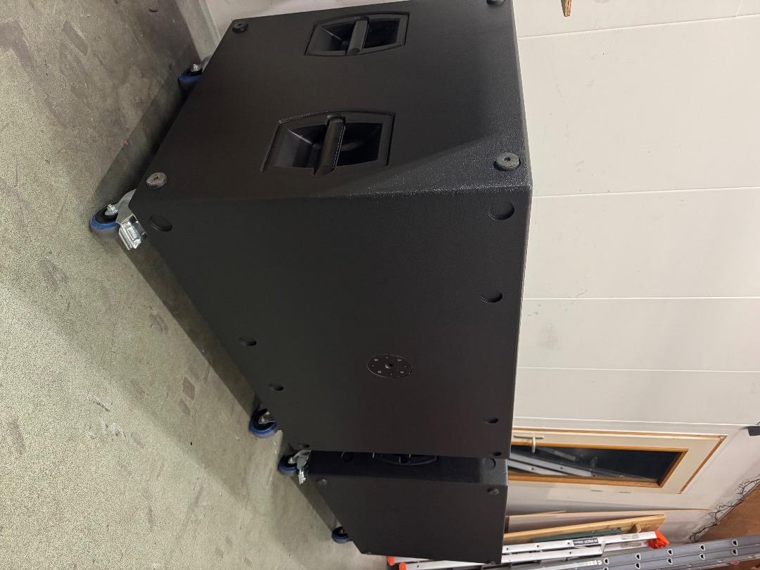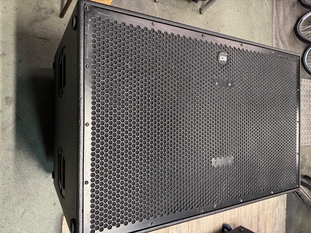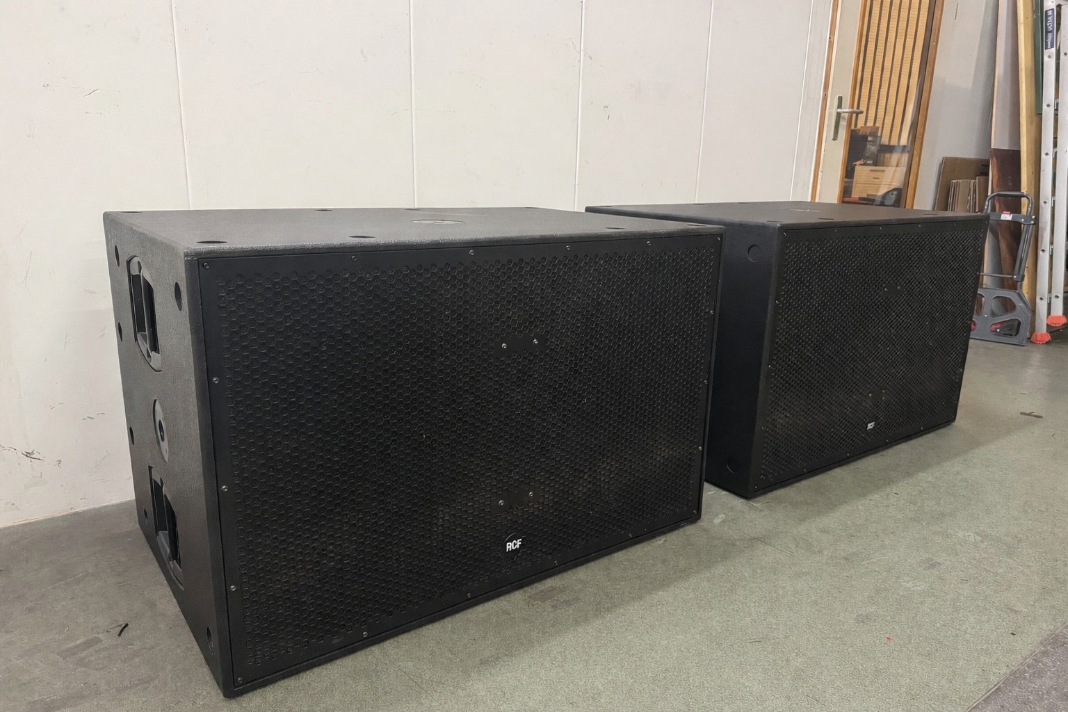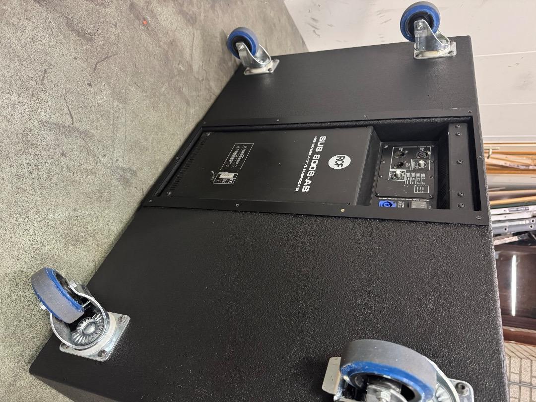 2x RCF 8006 Subwoofers in good condition with RCF covers and blue wheels.