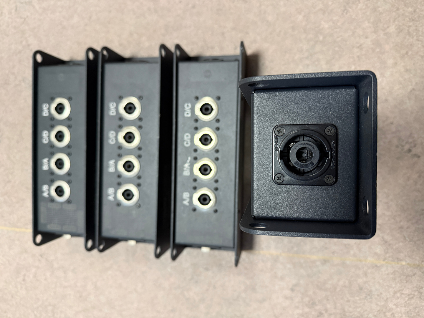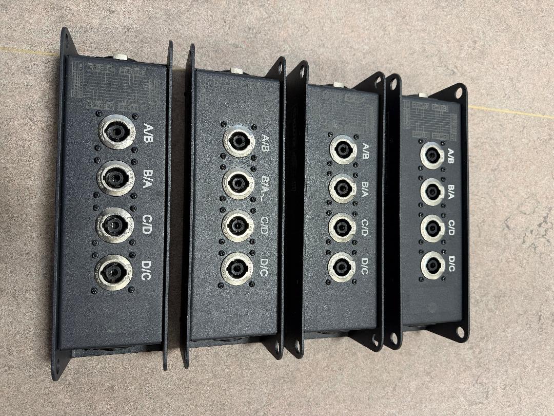 als „ausgangsbox“ lautsprecherseitig adaptiert die Box die lautsprecherkanäle wieder auf vier (A,B,C,D) oder zwei (A/B und C/D) NLT4MP-einbausteckverbinder