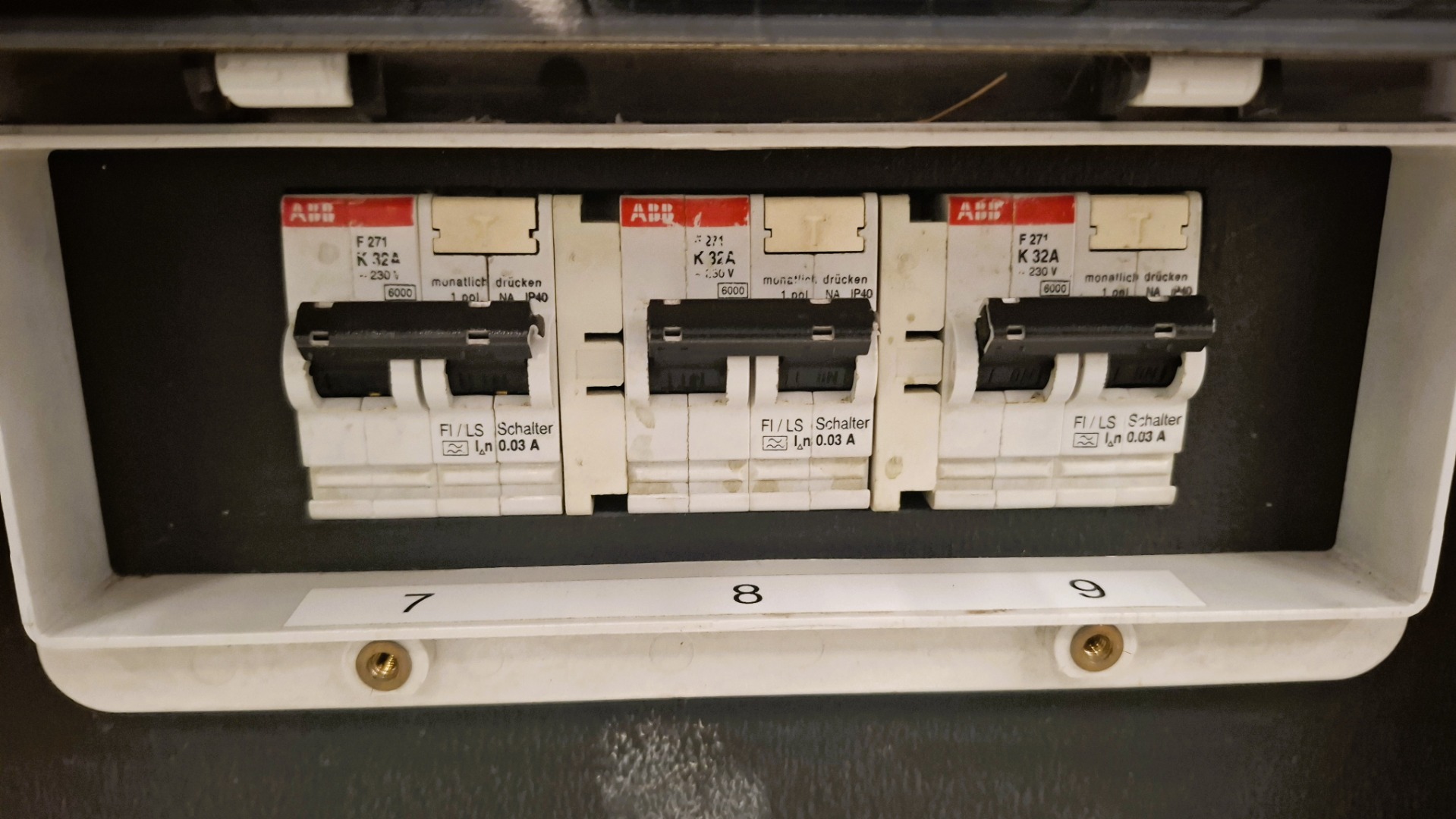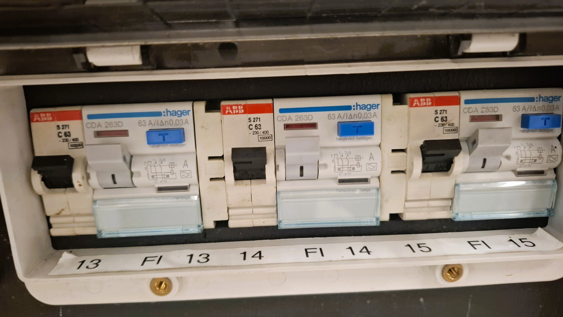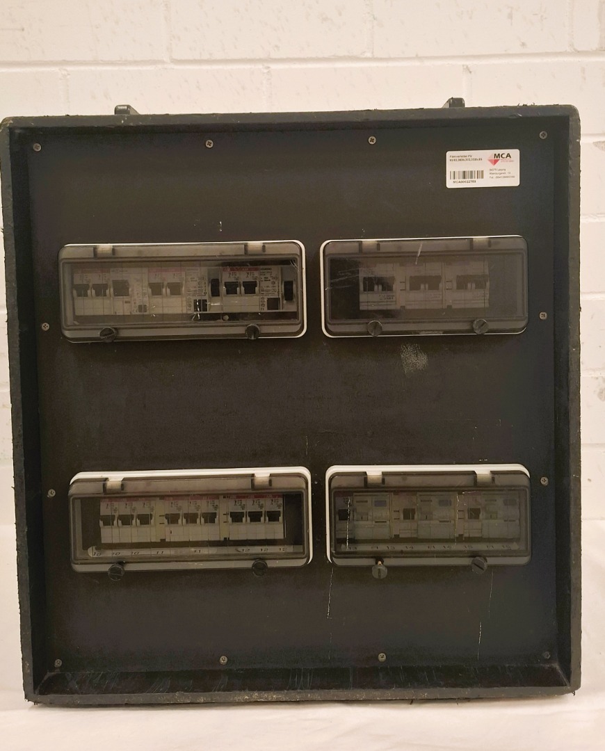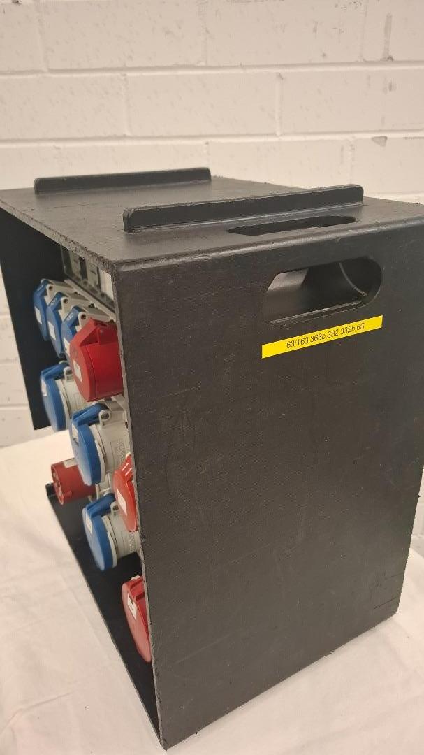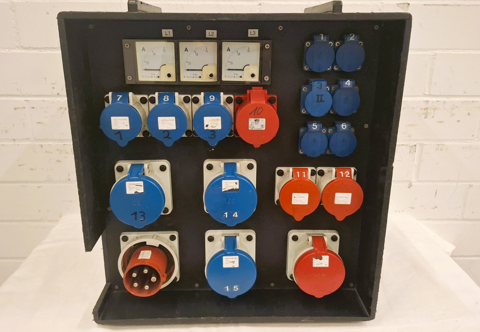 Großer Multiverteiler 63A >< 1x 63A, 3x 63Ablau, 3x 32A, 3x 32Ablau, 6x Schuko mit Amperemeter
