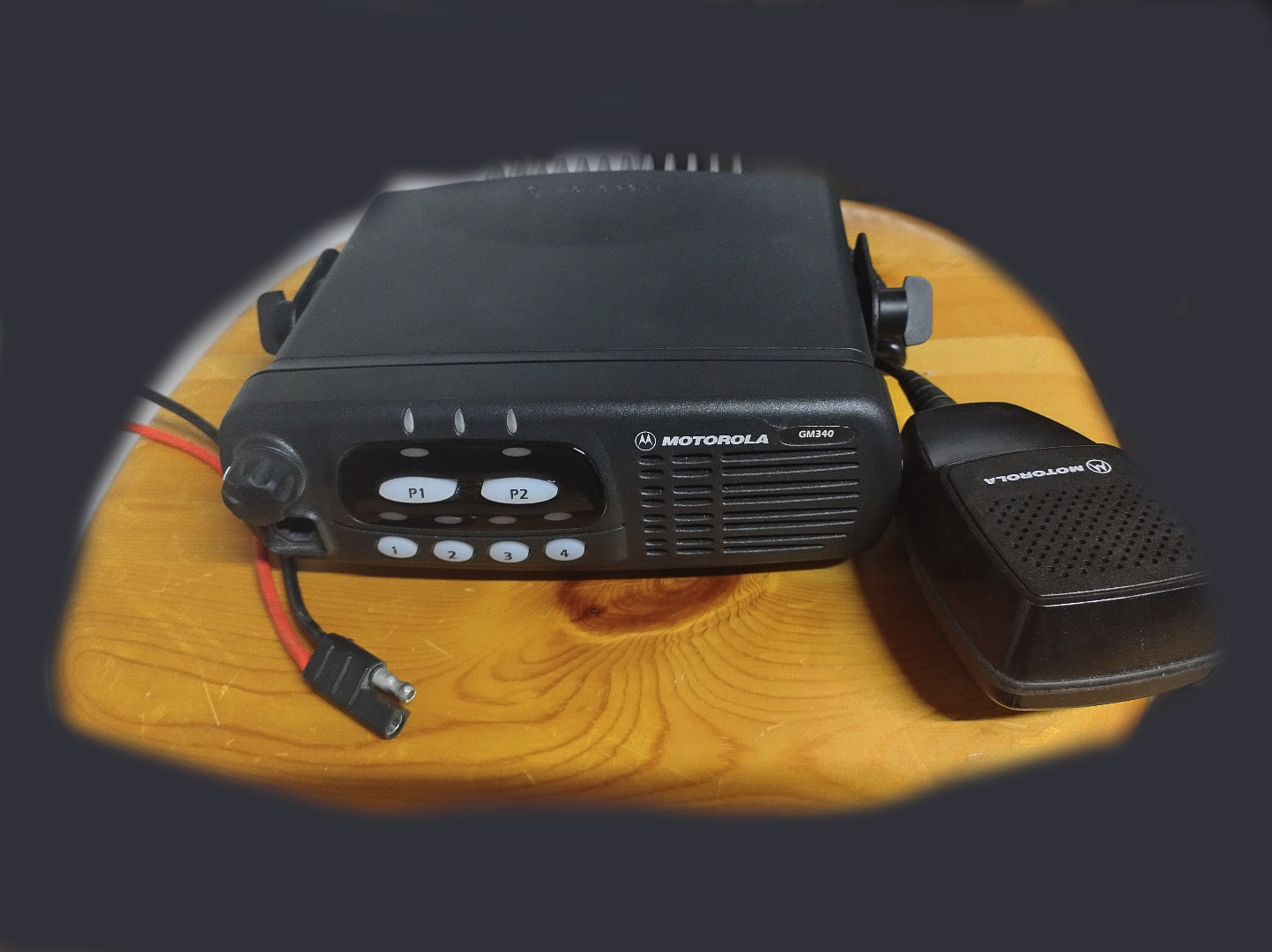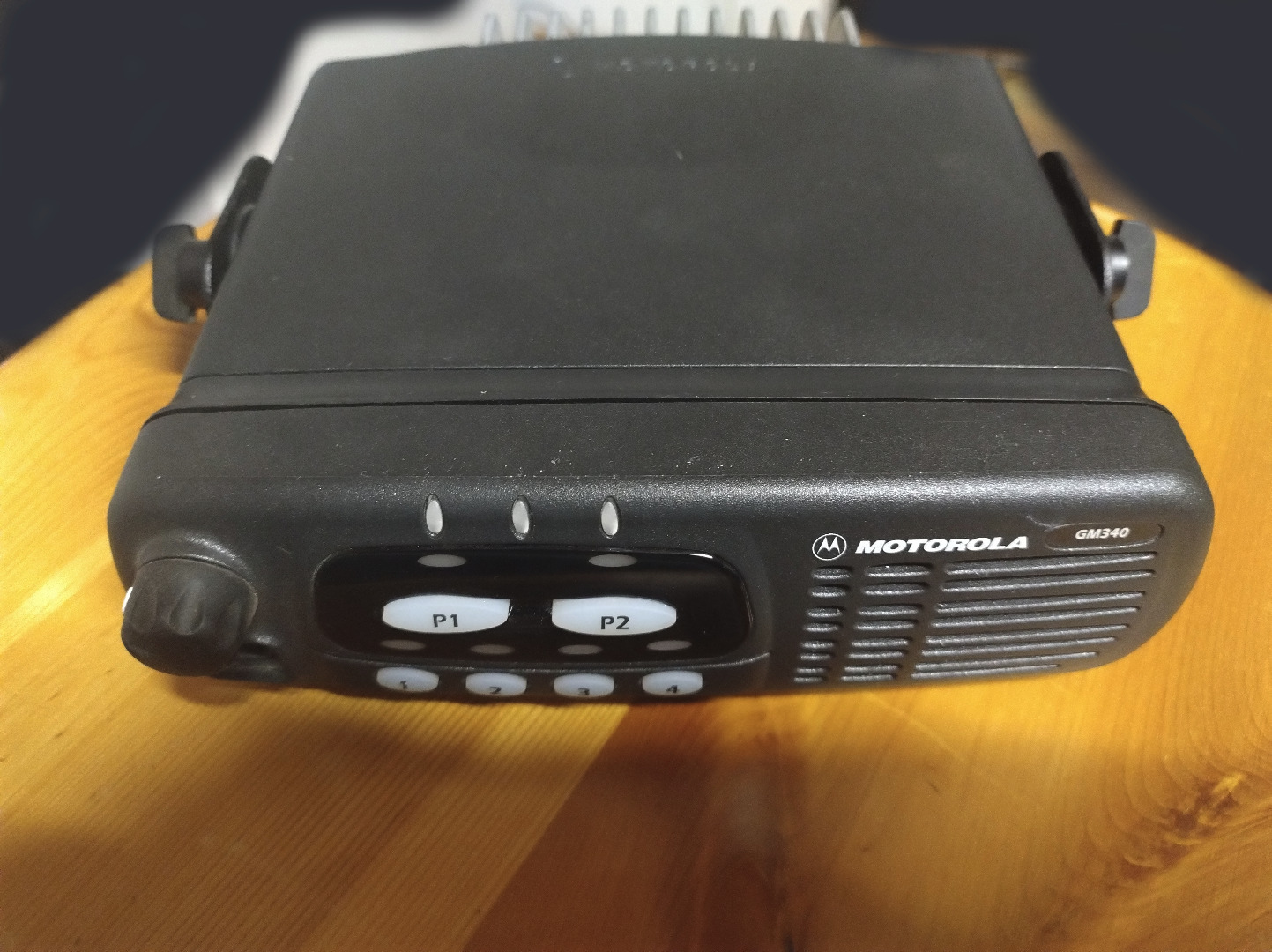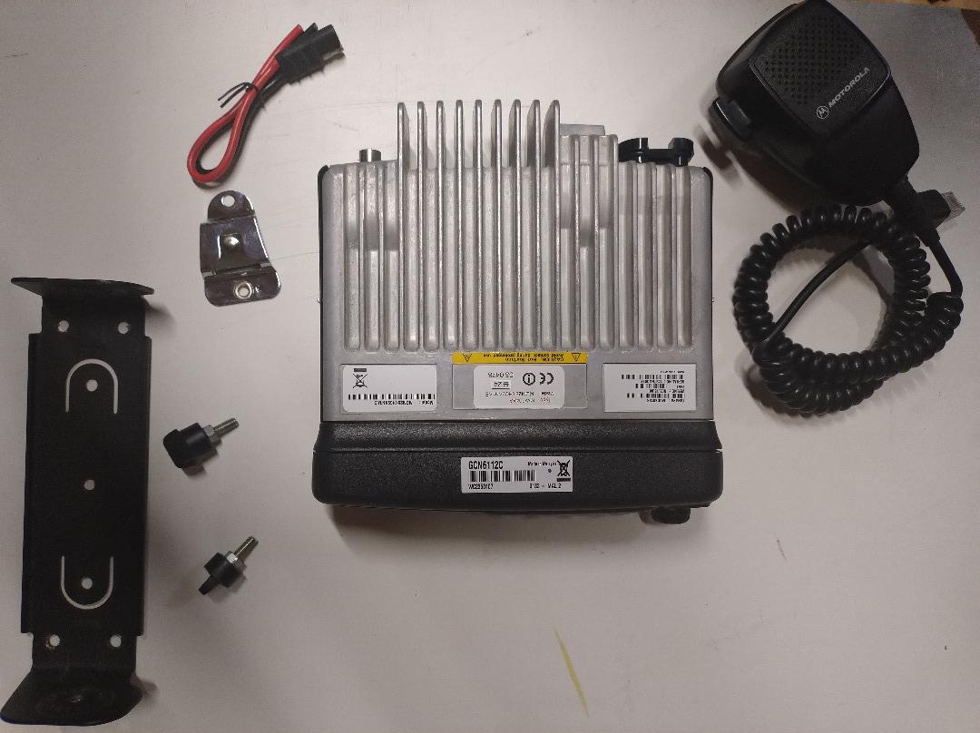 Motorola GM 340 VHF mit Mikrofon, Mikrofonhalterung, Stromanschlusskabel, Funkgeräte Halterung mit befestigungschrauben an der Funkgerät.