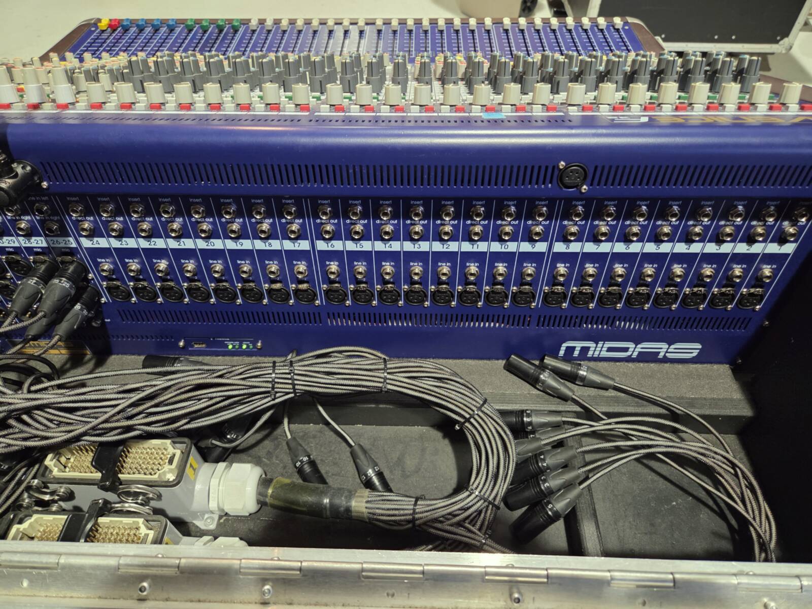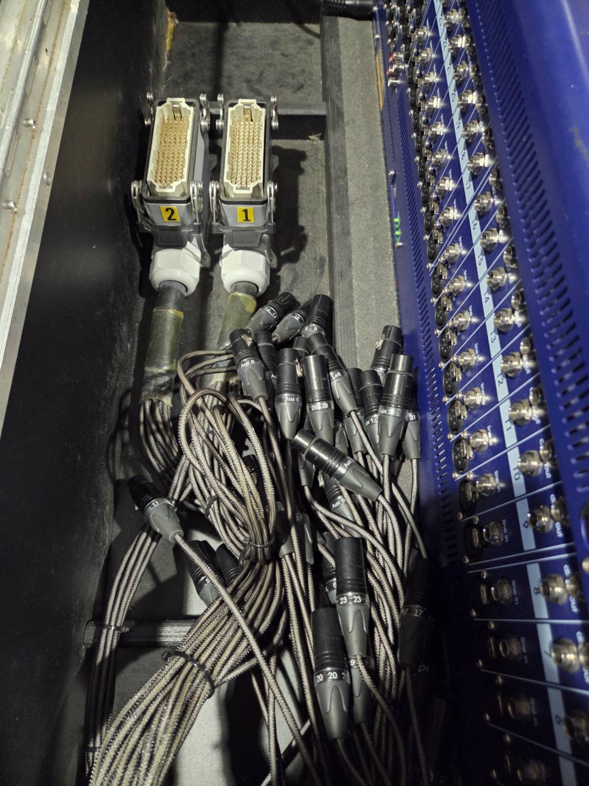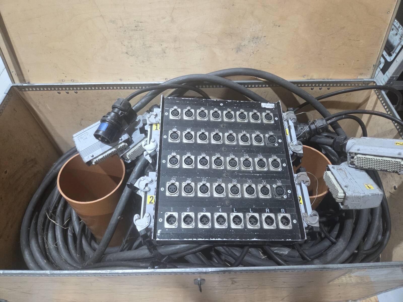 Comes as a complete set featuring a mixer securely housed in an Amptown flight case, a multi-cable organized in a wheeled plyfa box, and a stagebox offering 32 inputs and 6 outputs. Channel 11 is not functioning, while the rest of the system operates as intended.