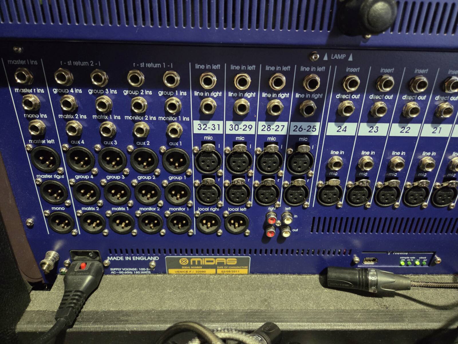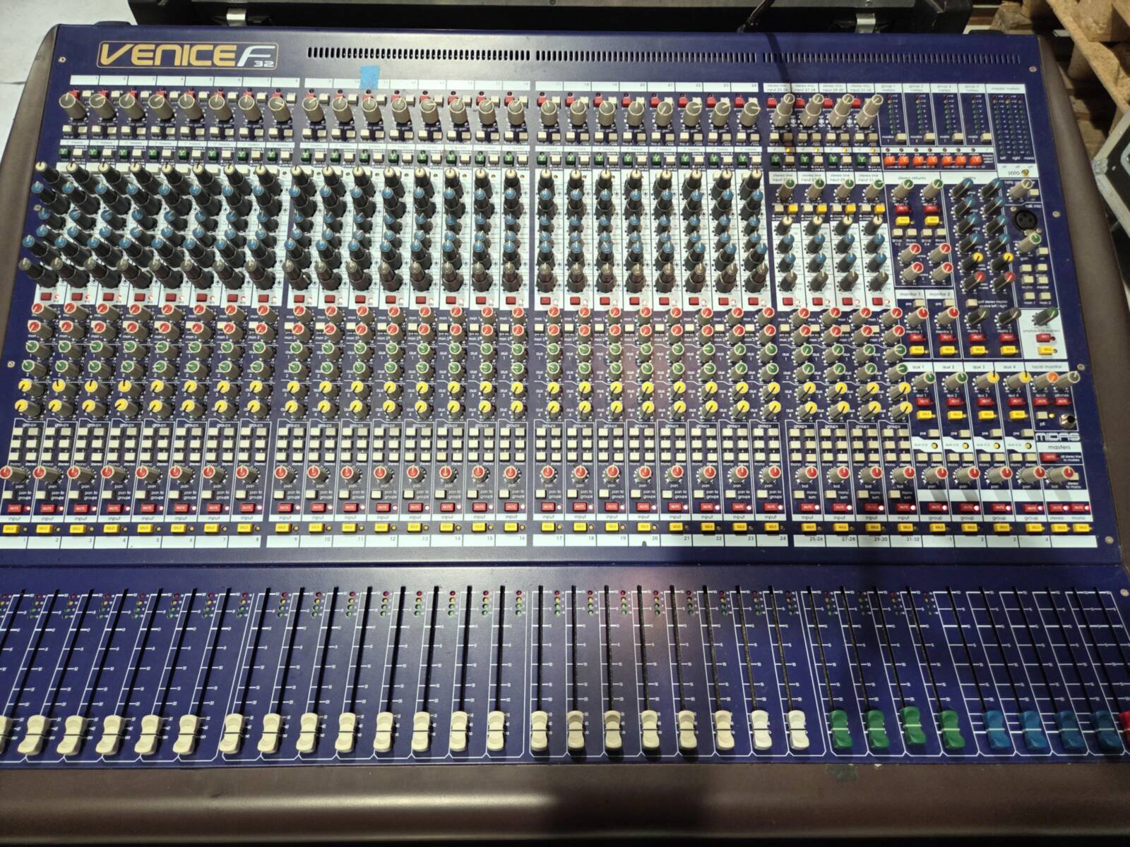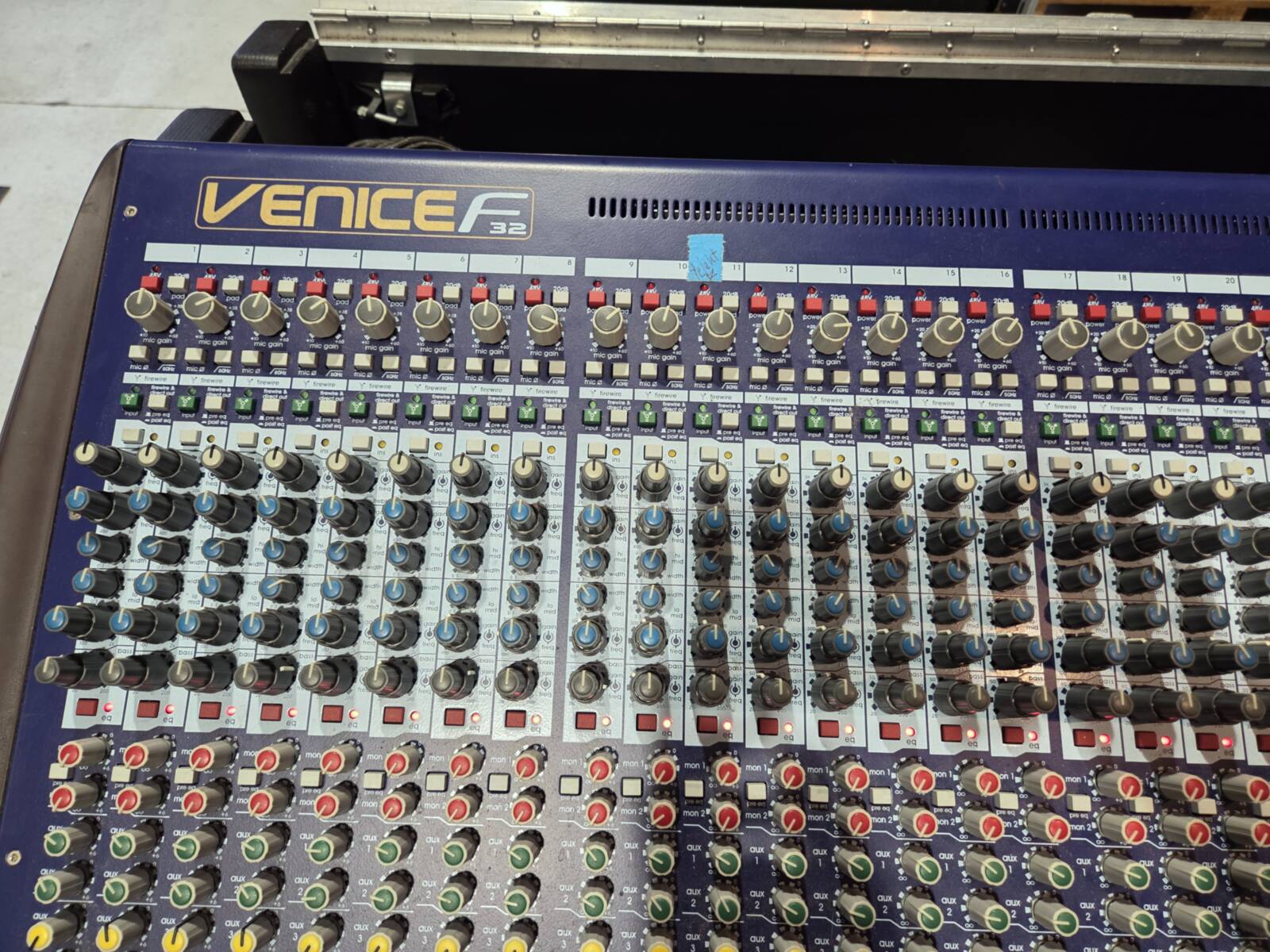Comes as a complete set featuring a mixer securely housed in an Amptown flight case, a multi-cable organized in a wheeled plyfa box, and a stagebox offering 32 inputs and 6 outputs. Channel 11 is not functioning, while the rest of the system operates as intended.