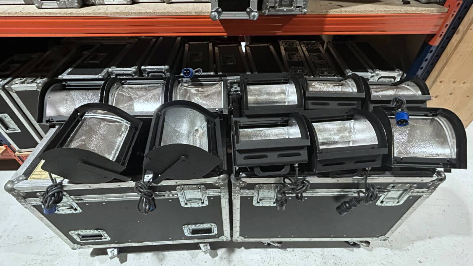Set of 11 asymmetrical flood lamps, each fully operational and supplied with a CEE plug, suitable for various lighting setups.