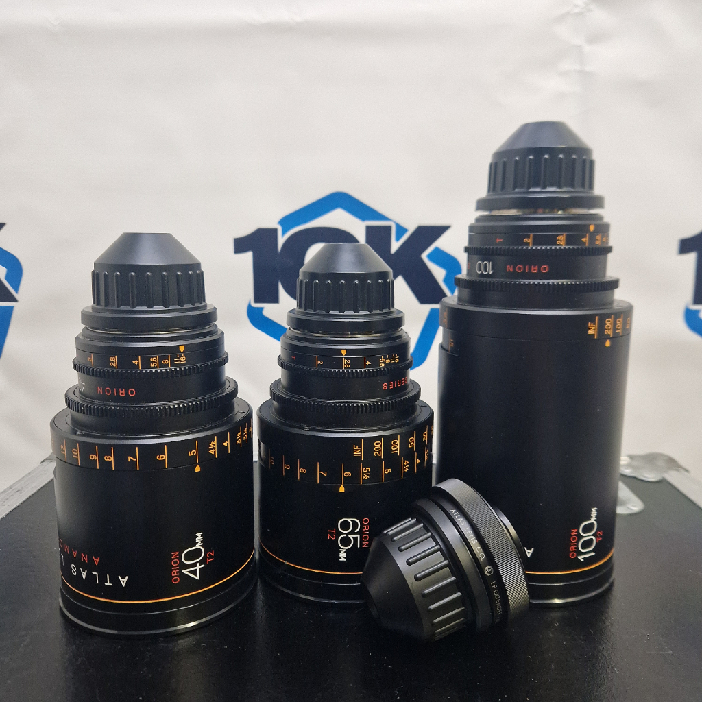 10kused.com: used Atlas Orion “A” Set includes 40mm, 65mm, and 100mm T2 Anamorphic Prime Lenses plus a 1.6x LF Extender.