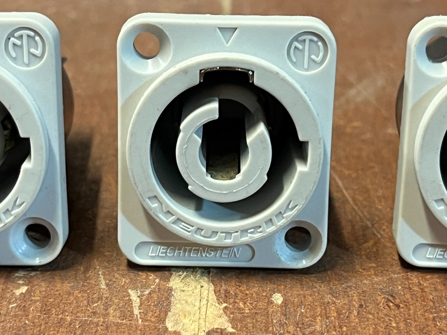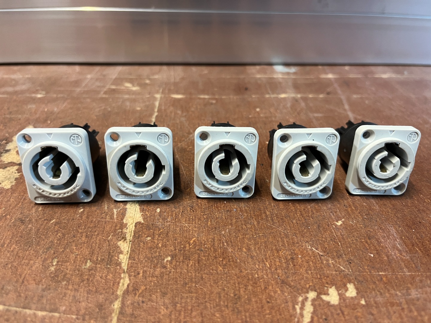 Biete ein Set aus 5 Stück grauen PowerCon Einbaubuchsen grau an.