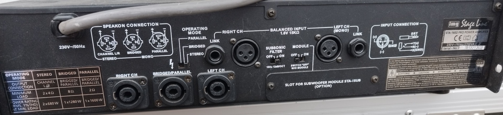 Gebrauchte Endstufe von Stageline. Leistung beträgt 2x680W RMS oder bis zu 1.600W gebrückt (s. Foto).