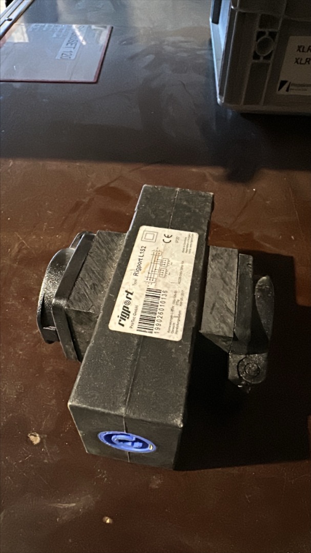 Der RigPortL1S2 ist eine BreakoutBox / Stromverteiler mit Powercon Anschlüssen und zwei seitlichen Schukosteckdosen.