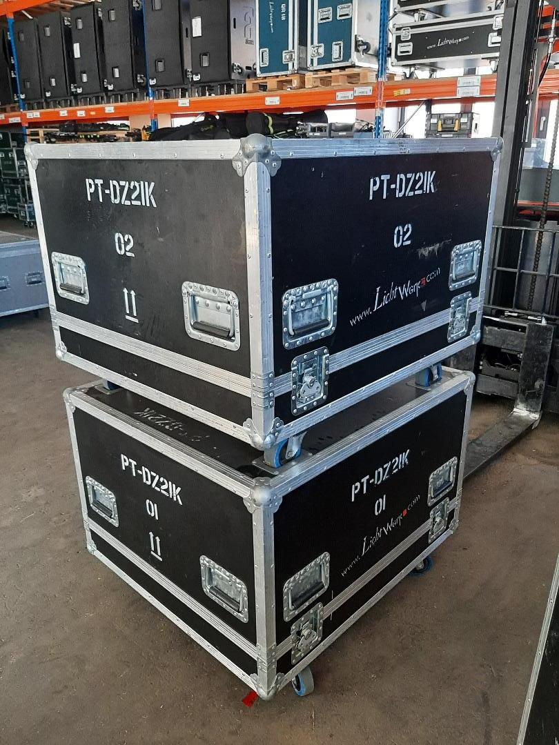 Verkauf von zwei Panasonic PT-DZ21KE Beamern im Pegasus Flugrahmen mit Case und Fernbedienung.