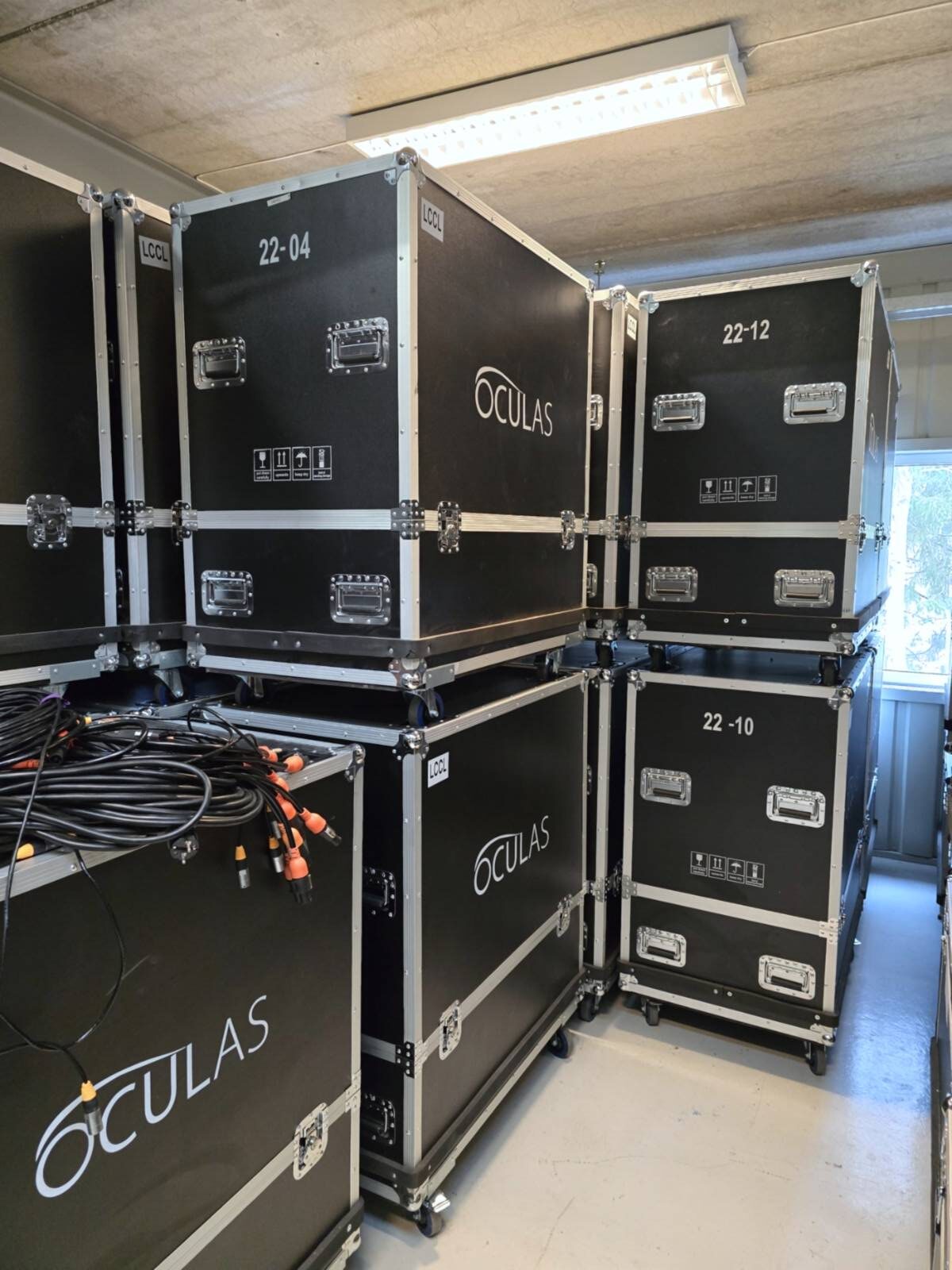 Complete 80-meter P6.67 LED screen system with Novastar VX16S, four panels per flight case, Kazo 4K Zither media server, and all required power and signal cables, only used once.