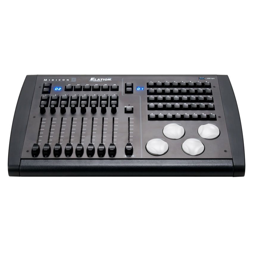The MIDICON-2™ is a professional USB powered Midi software compatible controller. An updated design from the original MIDICON™ controller, the MIDICON-2™ features tactile spring loaded buttons, (1) master and (8) control 100mm faders, (16) playback page buttons above faders, (8) rotary dials with push-in selection above faders, a bank of (32) instant effects or scene calling buttons, (1) blackout button, (6) general purpose buttons for often used functions, (8) bump/momentary effect buttons, (4) rotary encoder wheels with push-in selection, USB input for a gooseneck work light (not included), removable outer case for rack mounting (rack mount kit included), and a Kensington™ security device slot.