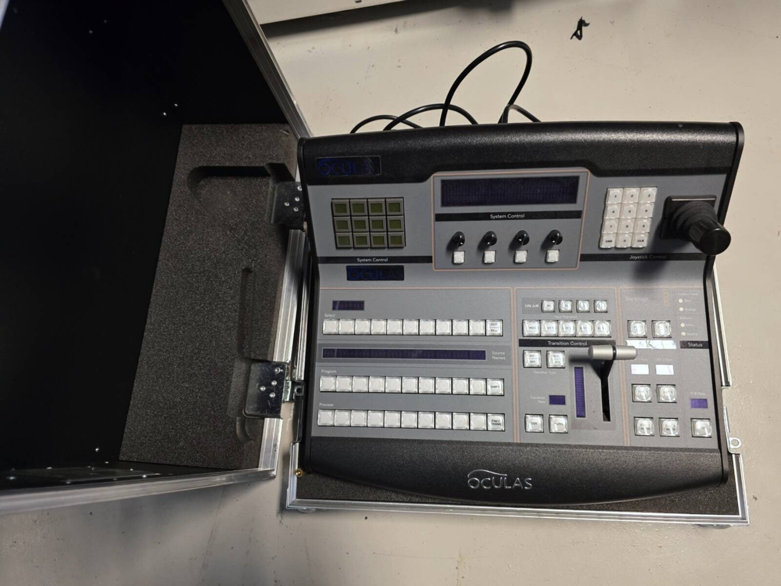 Production panel securely housed in a flight case, designed for managing multi-camera video switcher functions in professional environments.