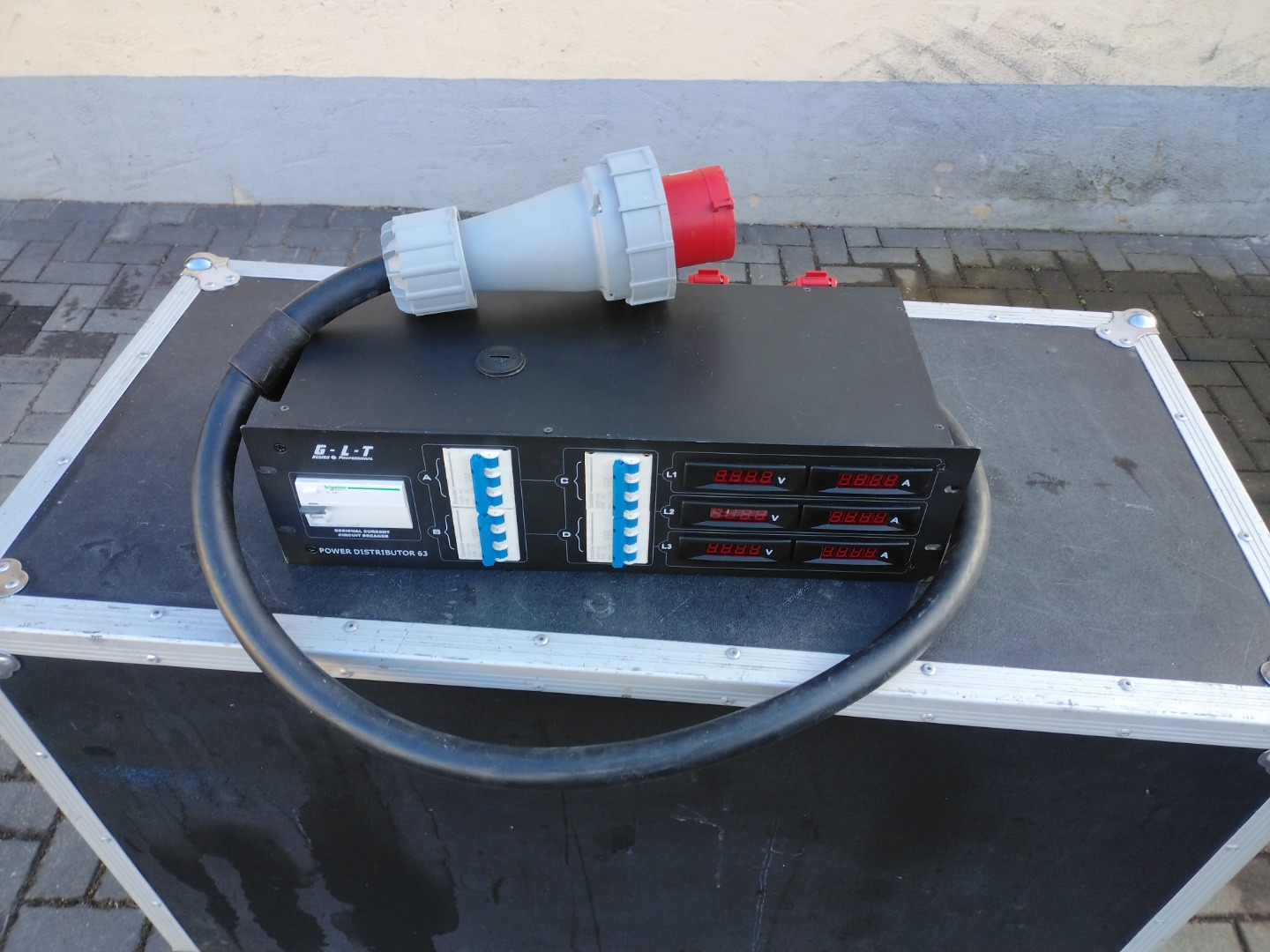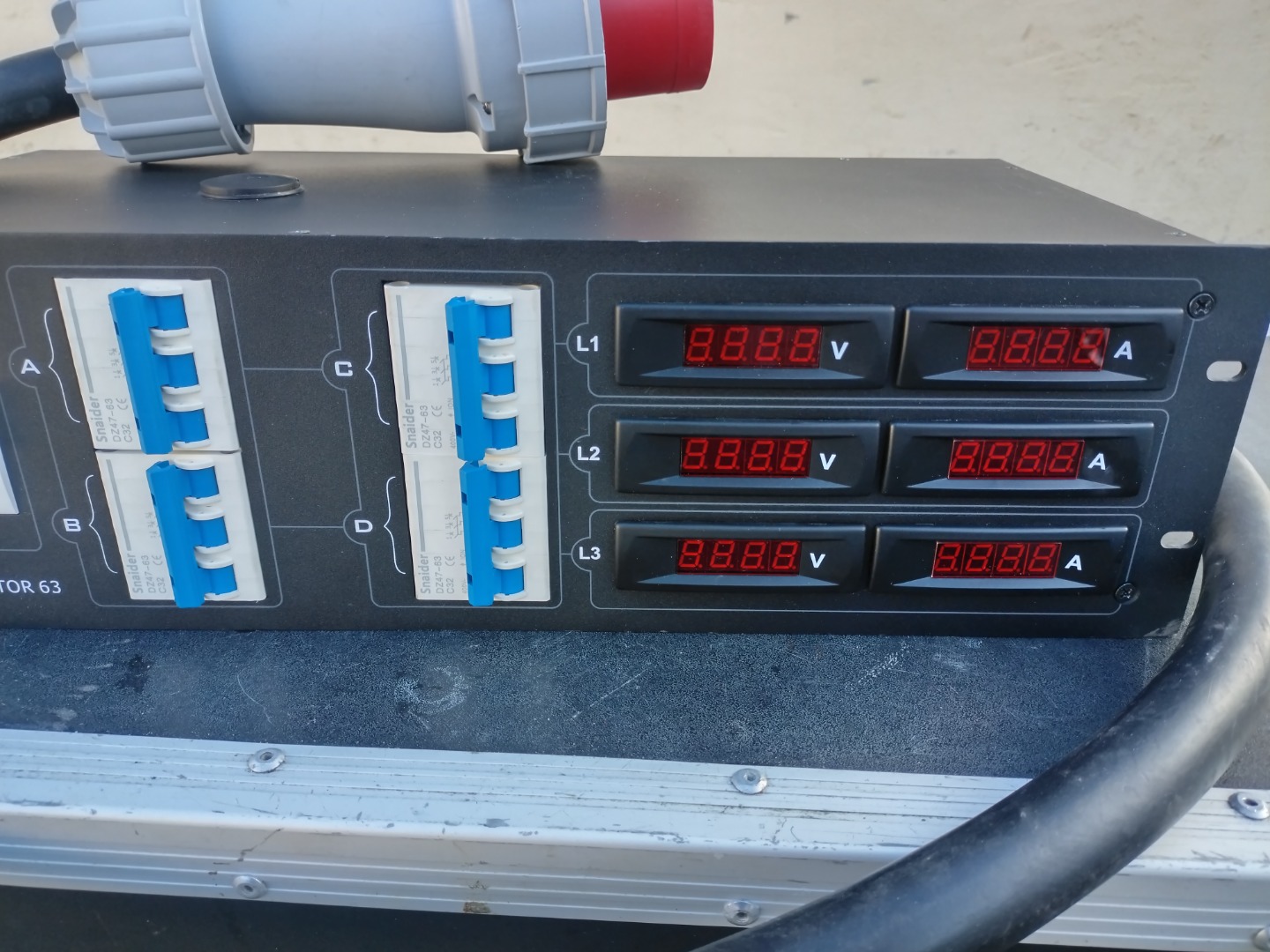 Der PSA-631 ist ein 63 A Stromverteiler mit 3 x 63 A/ 400 V Eingängen und 4 x CEE 3 x 32 A/400 V Ausgängen. Jeder Phasenausgang ist mit 32 A abgesichert und kann über ein 4-stelligen Volt- und Amperemeter ausgelesen werden. Zusätzlich ist ein FI auf der Frontseite verbaut, um vor Kurzschlüssen und Fehlströmen zu schützen.
