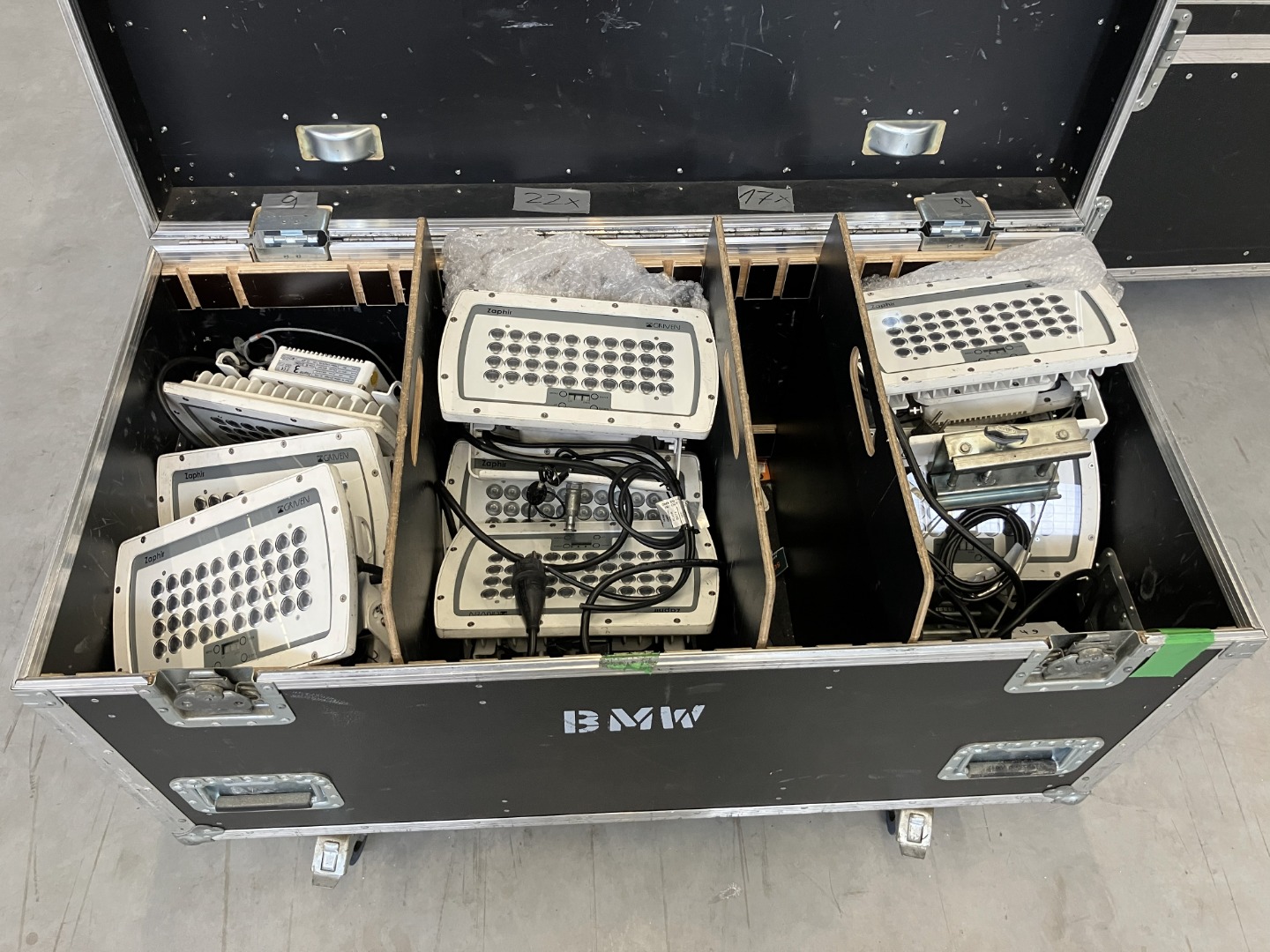 • 10x Safety, 13x Mini TV Zapfen, 7x Manfrottoklemme, 20x DMX Stecker fehlen,