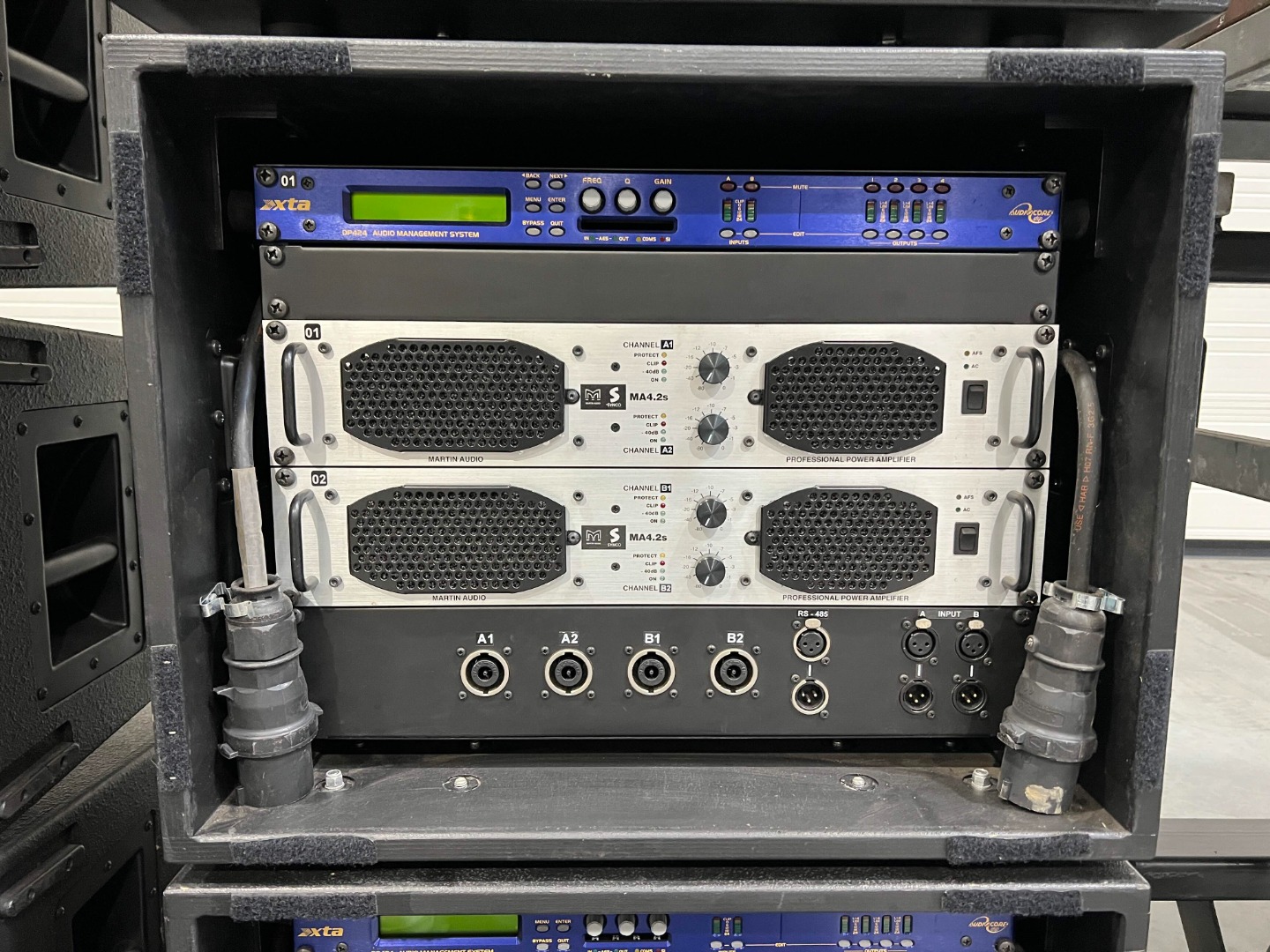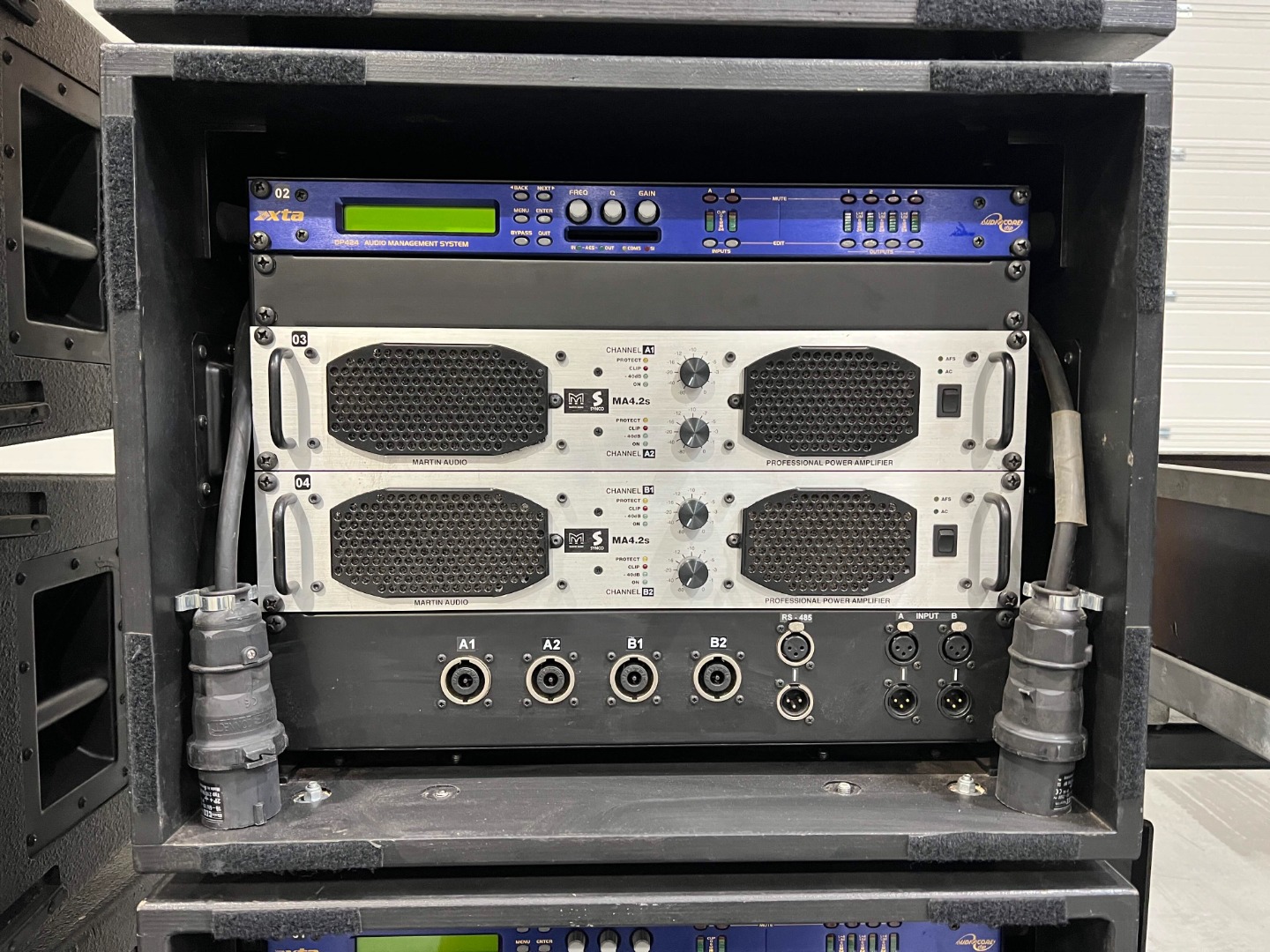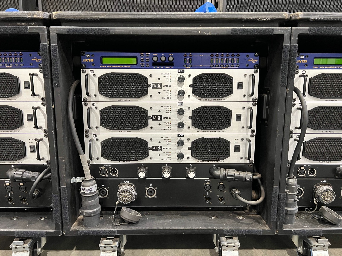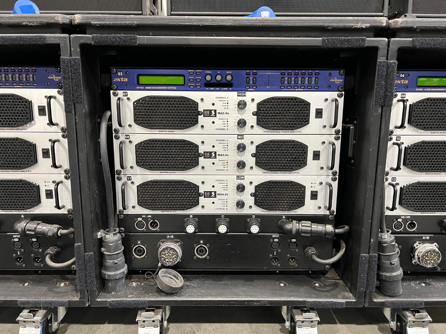 4 amplifier racks, each with 2x Martin Audio MA4.2 and an XTA DP426, are used for additional subwoofers.