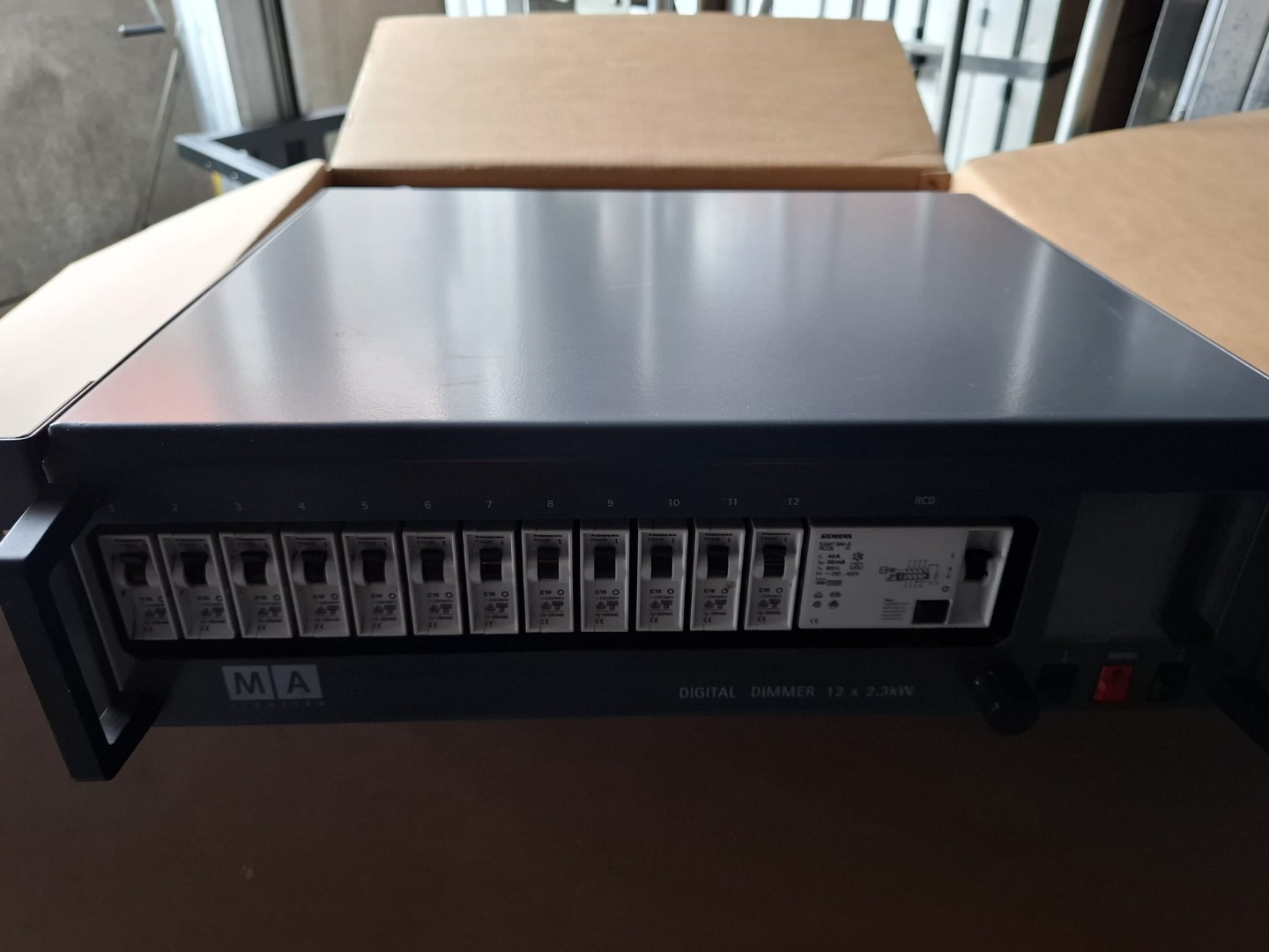 19"/3U digital dimmer module with twelve single circuits 2.3kVA and built-in residual current device (RCD, 30mA) on the input side. Other functions and design are as for the MA Digital Dimmer Touring 12 x 2.3kVA.