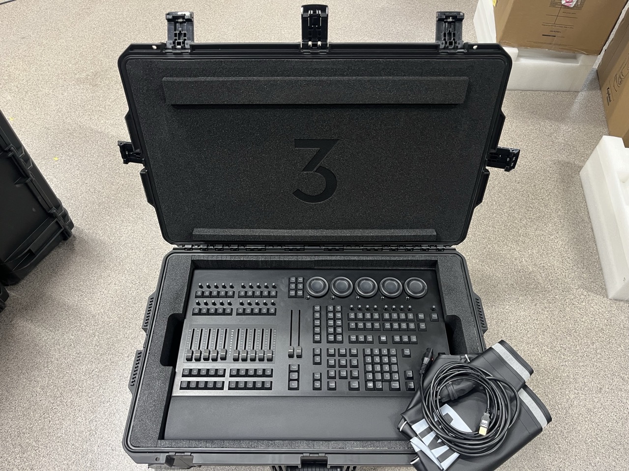 Professional lighting control wing designed for grandMA3 onPC systems, housed in a rugged Peli case, enabling mobile and flexible lighting operation for demanding production environments.