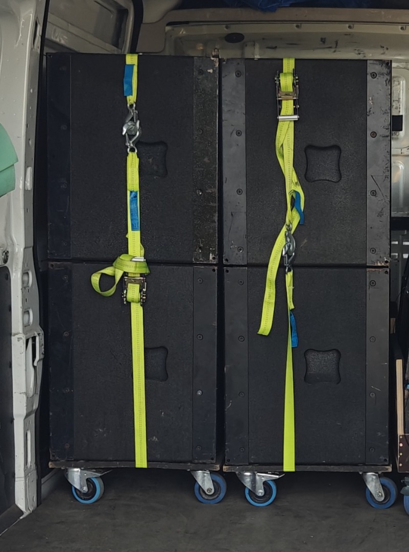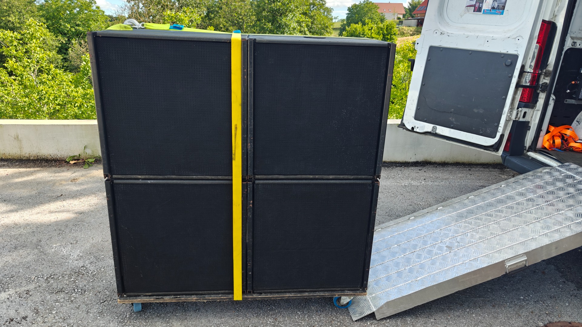 Die Speaker sind auf Rollbrettern zusammengestackt zu je 4 Stk. auf einem,