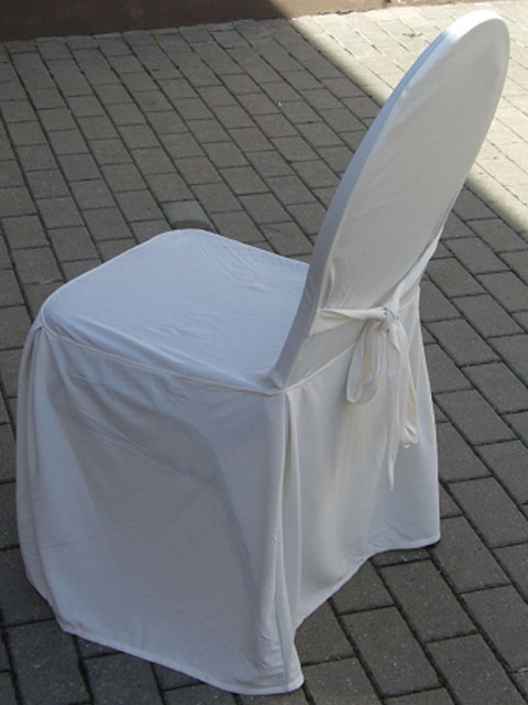 Stoff cremefarben, Bügelfrei, mit Schleife, kann kleine Gebrauchsspuren aufweißen; nur für Stühle ohne Armlehne geeignet
