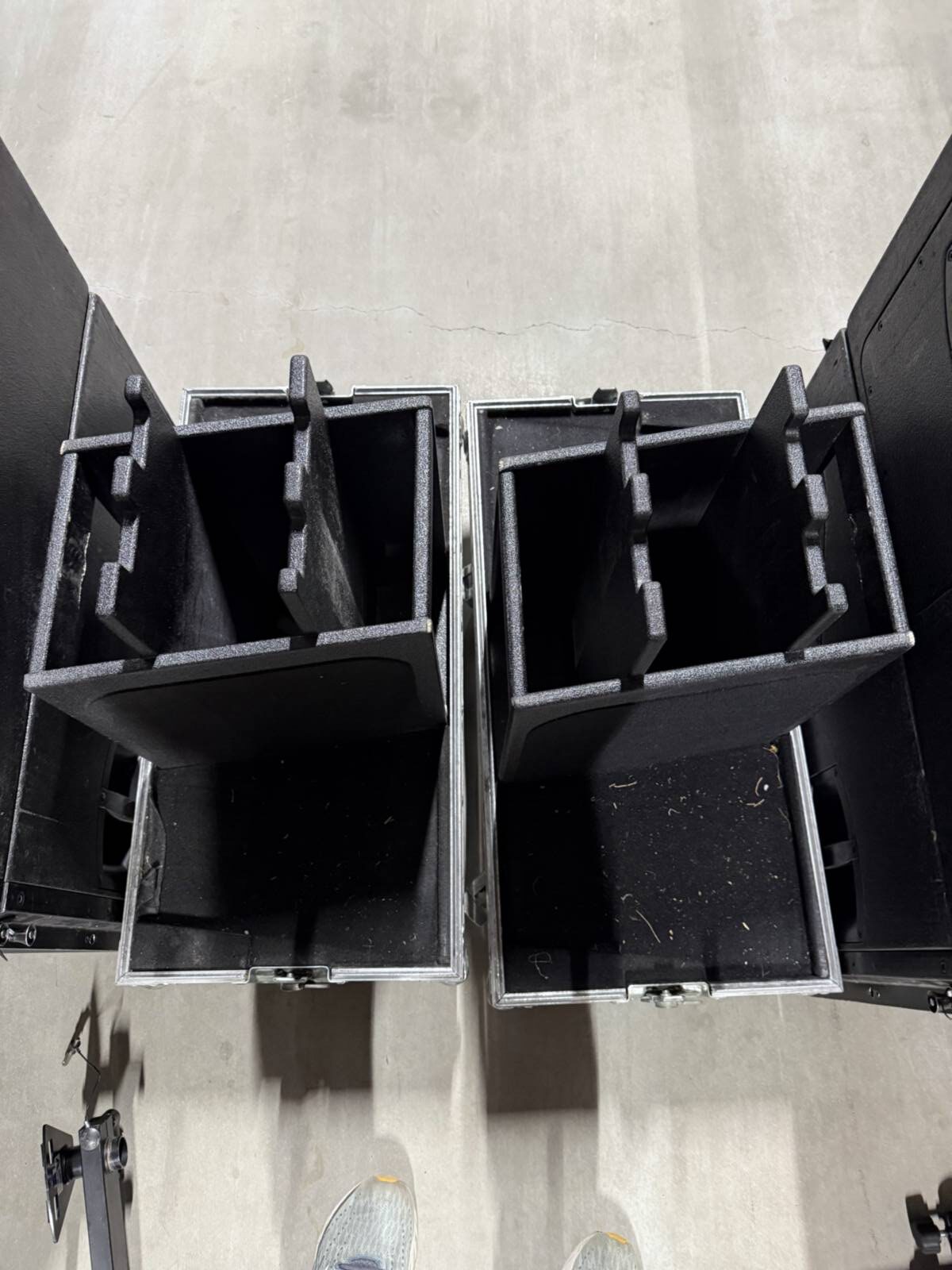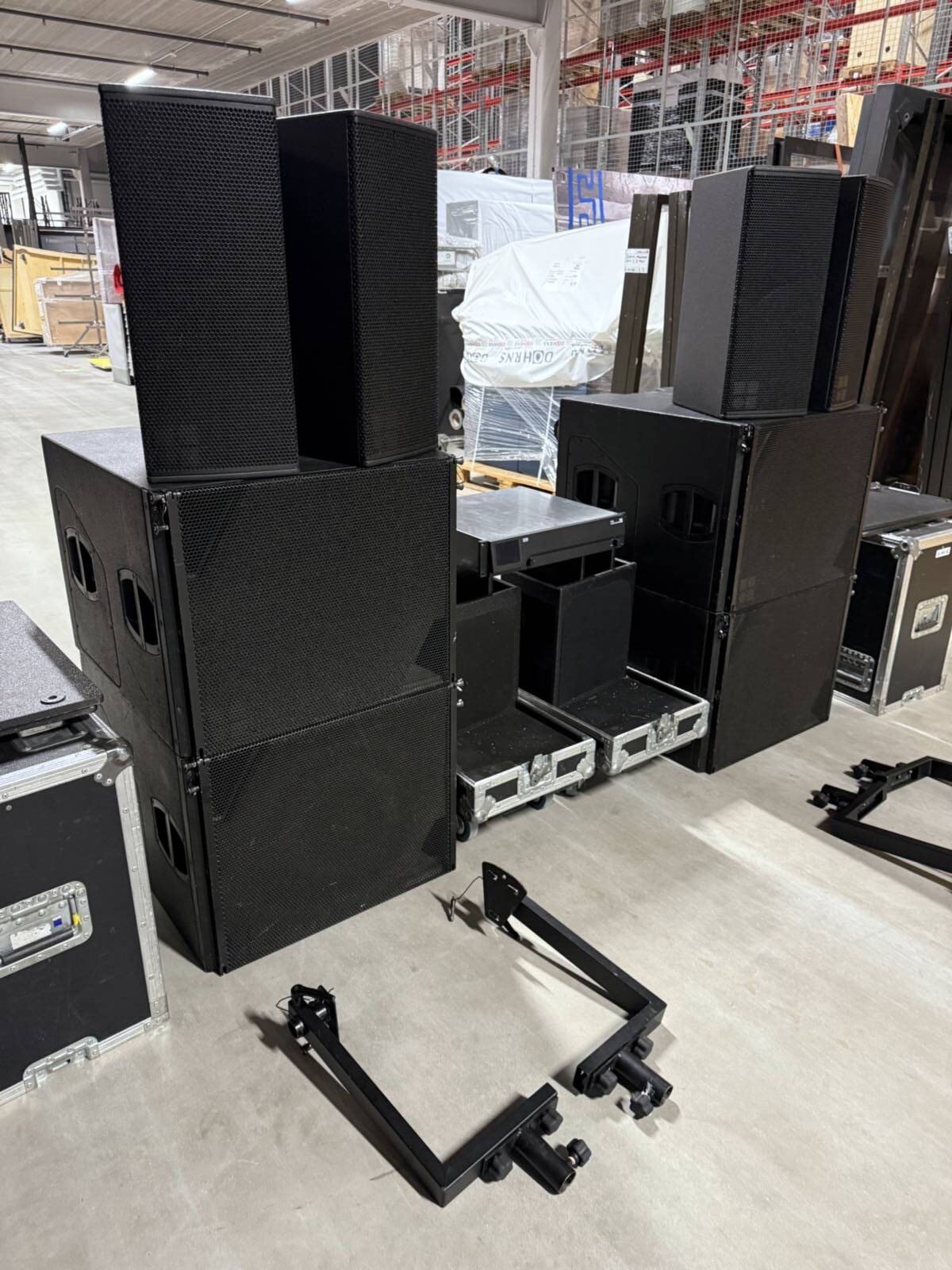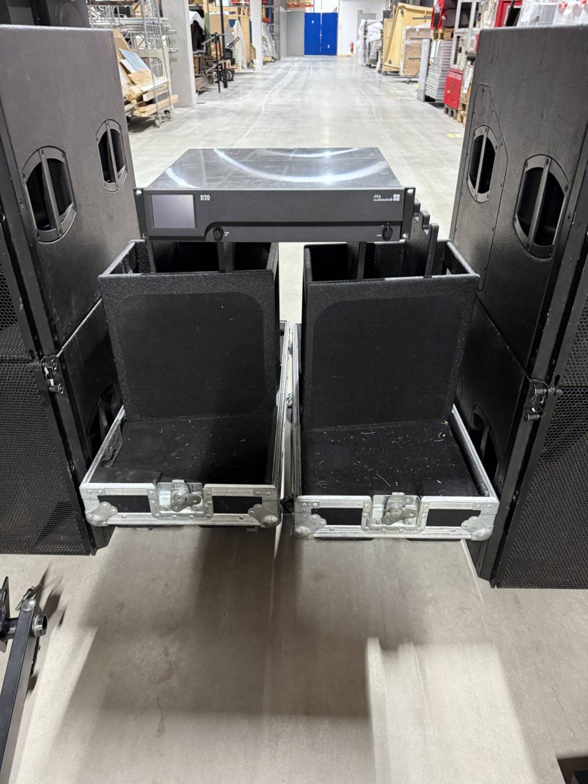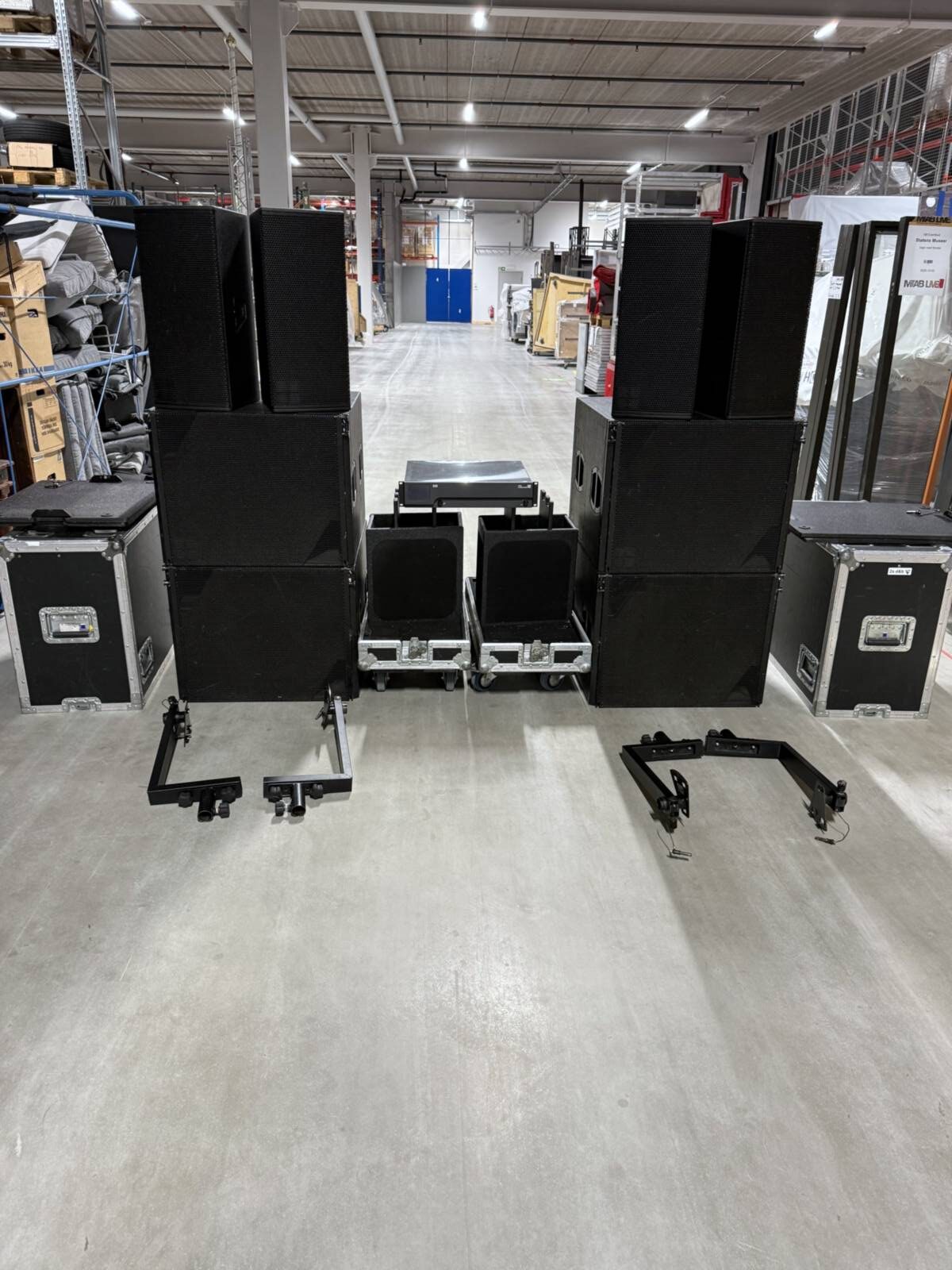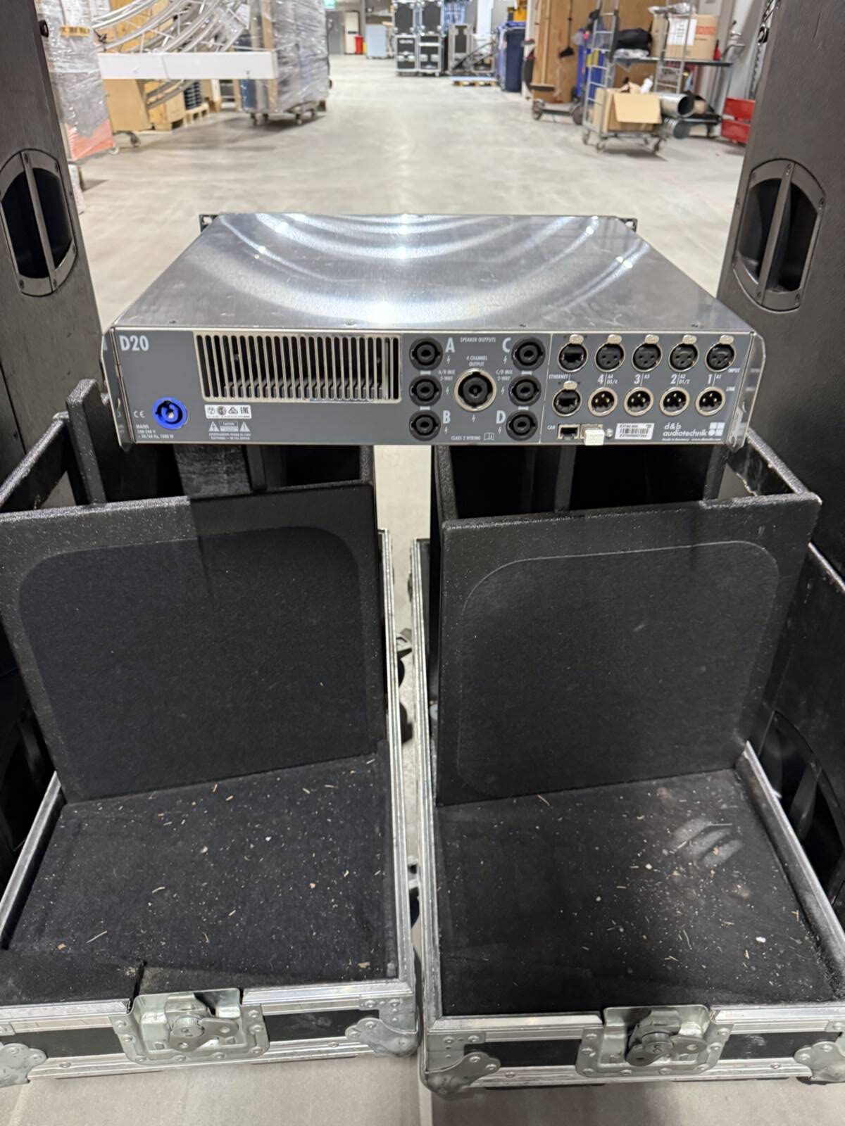 Full professional speaker system including four Y7p speakers with brackets and case, four Y-Sub units with wooden lids, and a D20 four-channel amplifier, providing a comprehensive sound solution ideal for medium to large events.