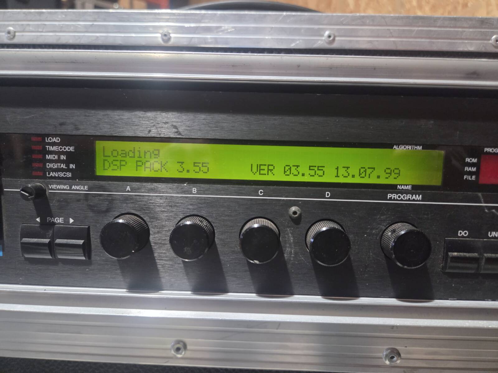 Highly regarded multi-effects processor recognized for its transparent and natural reverbs, ideal for professional studio use. Features include the DSP-2B processor, ADDA module with XLR analog I/O for smooth integration into analog setups, and a clear, sharp display. Module configuration "DSP-2B ADDA idx=32K" is shown at startup. Rack case not included.