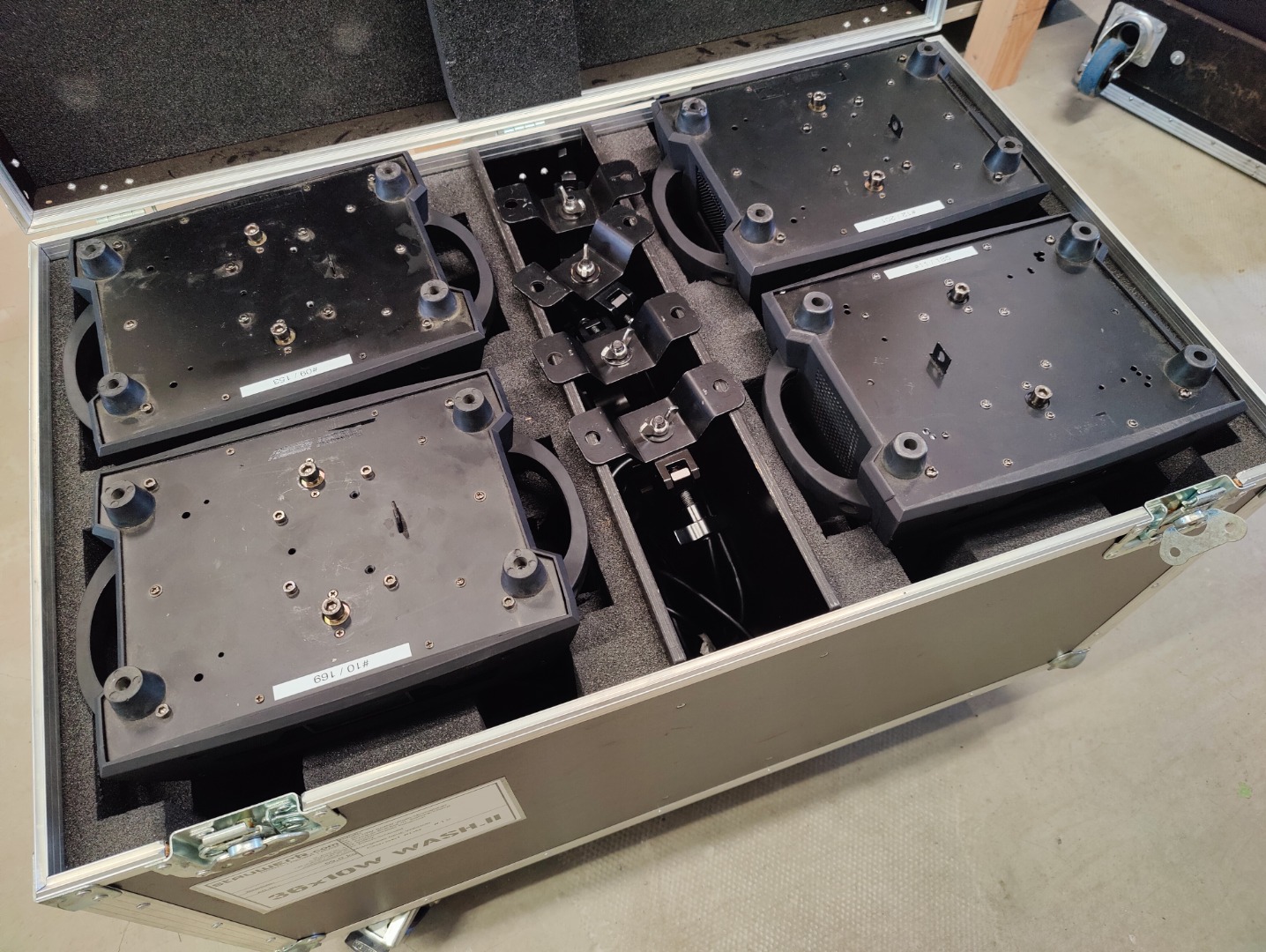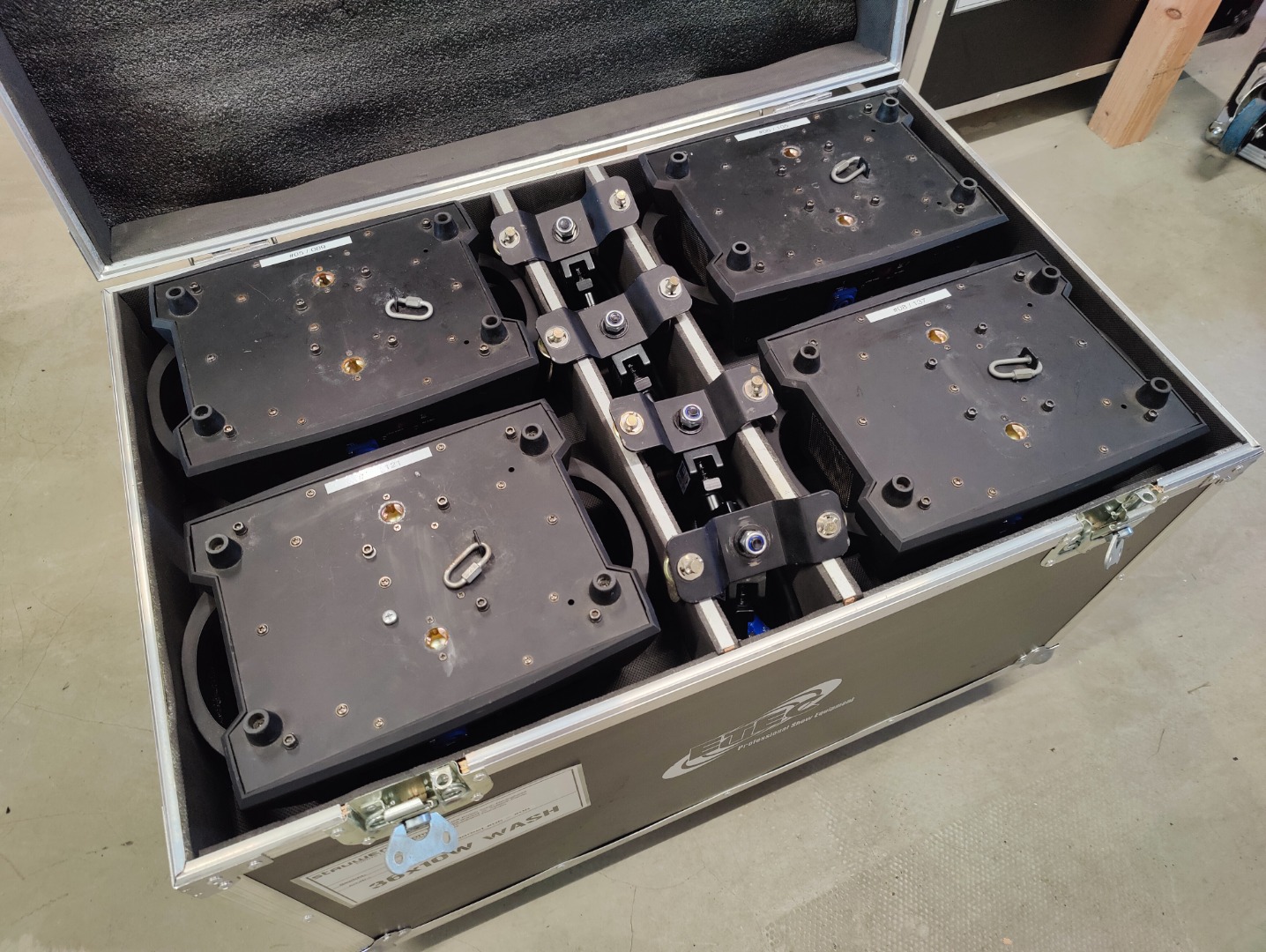 Die Geräte werden ausschließlich in Vierersets verkauft mit jeweils einem Vierercase inkl. der Brackets und Anschlusskabel. Die Trussclamps sind NICHT mit im Lieferumfang!