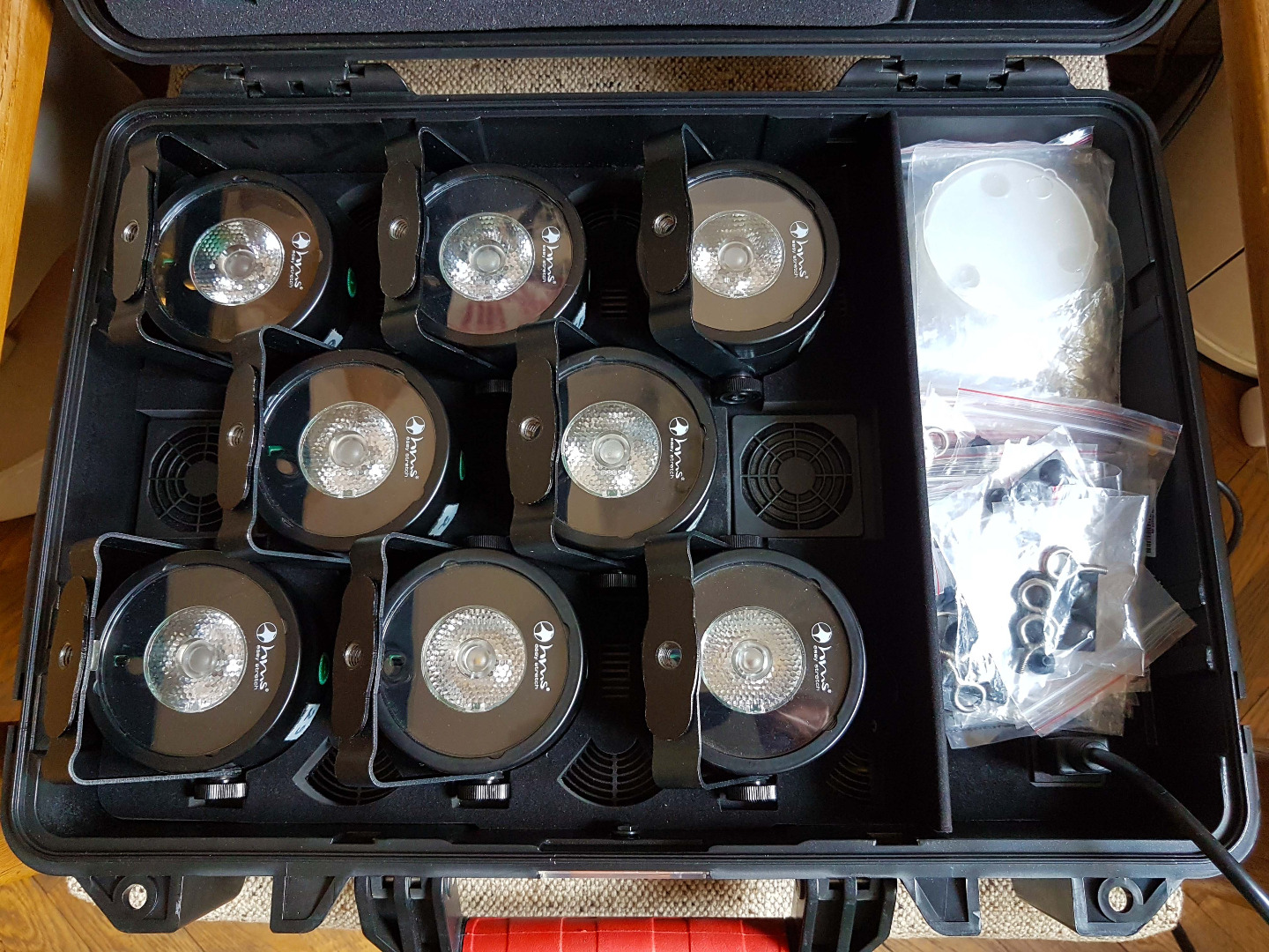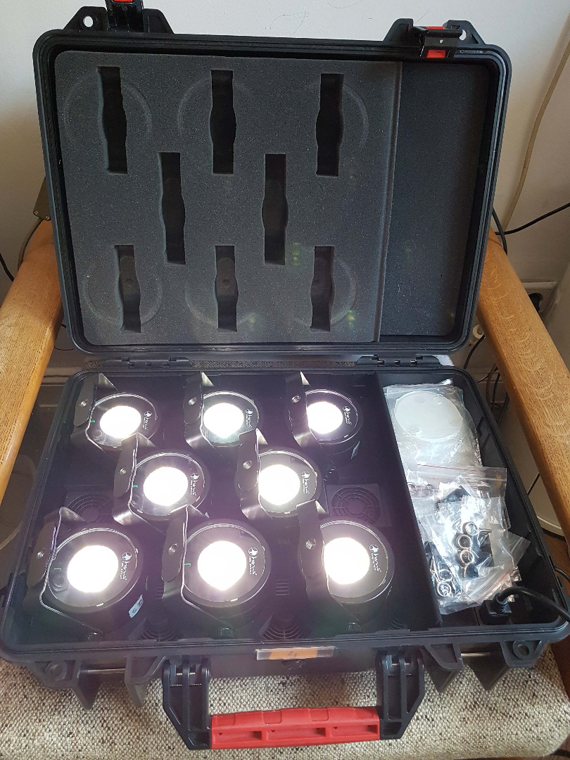 Allein der Ladekoffer, der auch zu den original AX3 passt, kostet ca. 350,00 netto. Auch die Diffusorscheiben und Gummifüsse und Schraubhaken sind dabei.